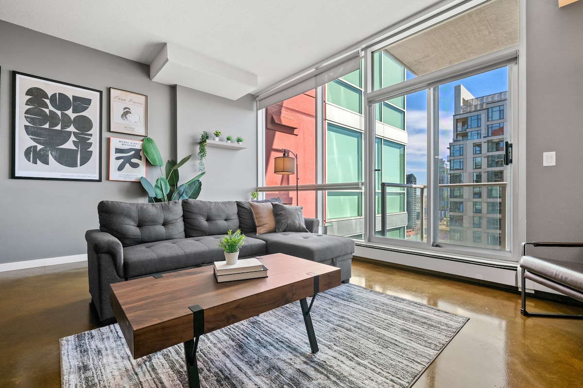 Enjoy world class City and Mountain views and executive level design and furnishings in this beautiful and modern upper floor condo with an industrial flair. Relax in the space or find yourself in the center of the city to enjoy all that it offers including bars, restaurants and city events at your doorstep. This incredible property has all amenities, amenities include a 180 square foot private balcony, Pool (Seasonal) gym, and dedicated parking stall.