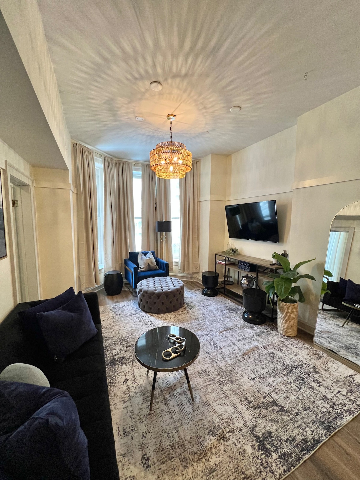 Ideally located just half a block from Michigan Avenue, this apartment boasts high ceilings, beautiful wood floors, with thoughtfully appointed rooms for your comfort. You will have everything you need to enjoy your stay in style! PLEASE NOTE: 4th floor walk-up (NO ELEVATOR). There is a small neighborhood bar on the second floor of the building. They are respectful of our neighbors, however they do play music which can be heard leading up to the apartment but never in the apartment.