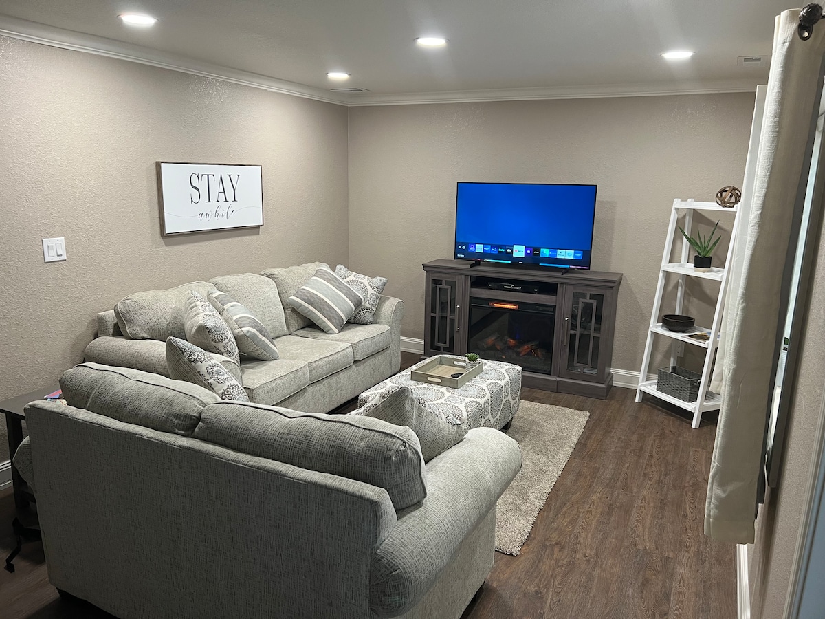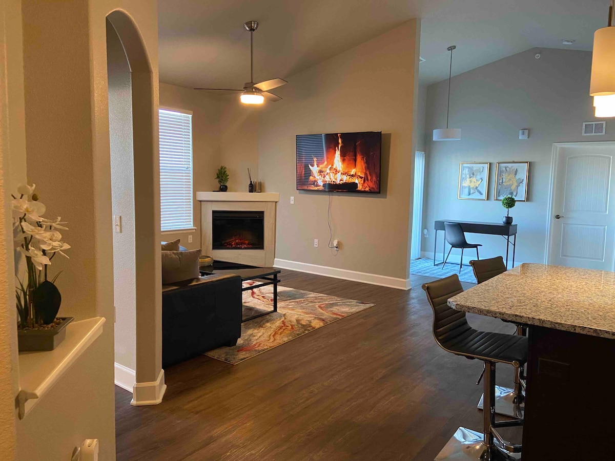 There’s a river in the backyard next to the private hot tub and sauna, what more could you need?! If you love watching local wildlife, listening the sound of the creek with a cup of coffee in hand, and relaxing on a luxurious back patio that’s perfect for all seasons, then you should probably book here. Enjoy the full amenities of a kitchen stocked with a curator’s touch, heated towel rack, remote control gas fireplace,top-to-bottom remodel. Book RiverHouse South before someone beats you to it!