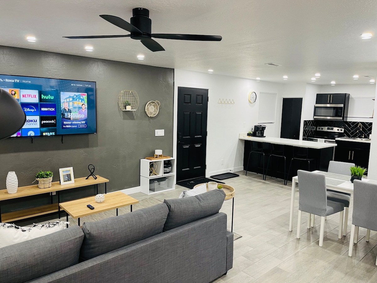 Enjoy your stay at this large newly renovated one bedroom in the heart of downtown Flagstaff. The unit has a large fenced backyard that opens into the unit. Conveniently located on Humphreys close to the action of downtown, Snowbowl ski mountain, hiking and biking trails. The bedroom has a large king size bed and a work desk. The living room has a queen pull out sofa in addition to a large flatscreen TV. Plenty of free parking and room to relax & enjoy Flag!