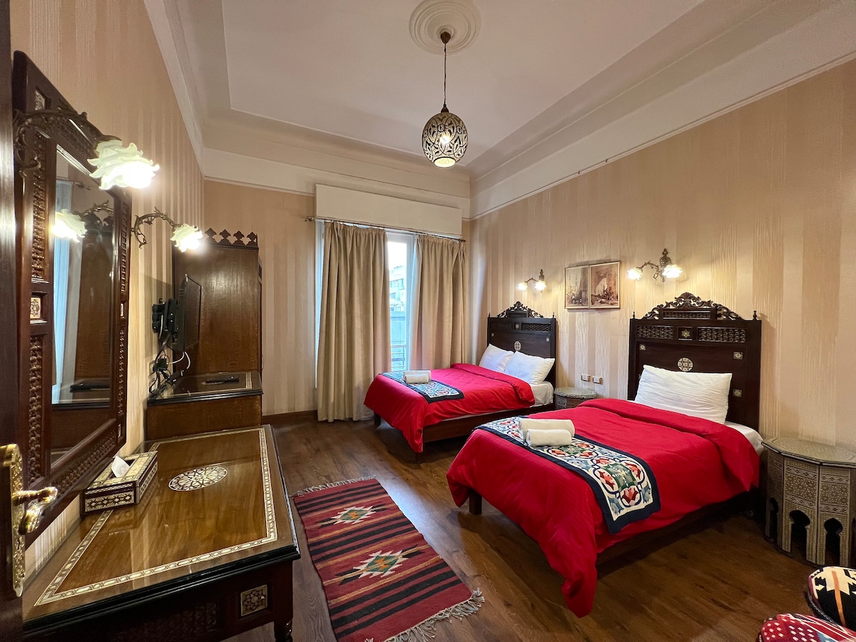 Embrace Arabesque splendor in this 4-bed downtown apartment. Just steps from Khan el Khalili, Tahrir Square, Moez Street, Abdeen Palace and 15 mins drive to The Great Pyramids, explore Cairo's rich history and vibrant culture. With stores and beloved cafes at your doorstep, indulge in the city's charm. Housed in a historic building once inhabited by movie legends, enjoy 24/7 security and attentive building managers, ensuring peace of mind in the heart of the bustling metropolis.