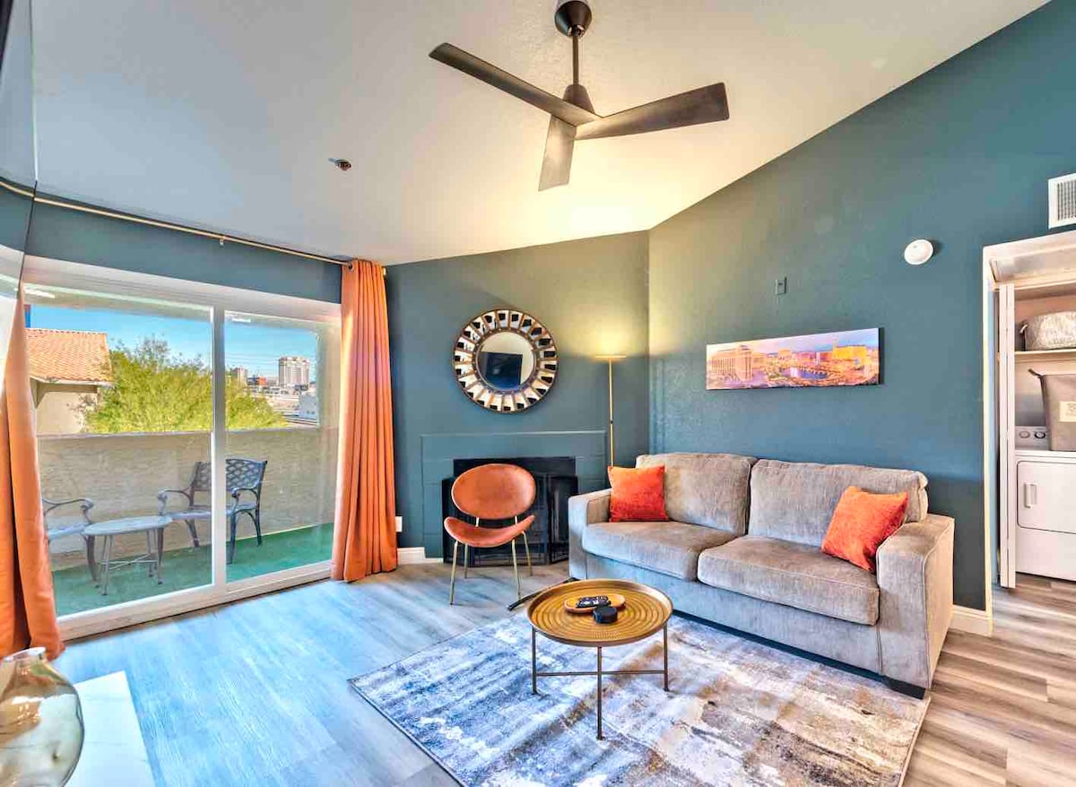 ★NEWLY RENOVATED★ GROUND Floor 1BR Condo with BALCONY! 5-min ride to Strip by Uber/Lyft. Walking distance to Walgreens, Rio, Bellagio & Caesar's Palace. 15 mins to LAS airport & convention center! - Complimentary Keurig for your coffee cravings - Professionally cleaned w/ a fully equipped kitchen - LARGE 65-inch 4K smart TV - GATED community w/ 24/7 security - Remote friendly workspace - FREE: Parking, gym, pools, hot-tub, high-speed Wifi Your ULTIMATE retreat for a recharge and endless fun!♫