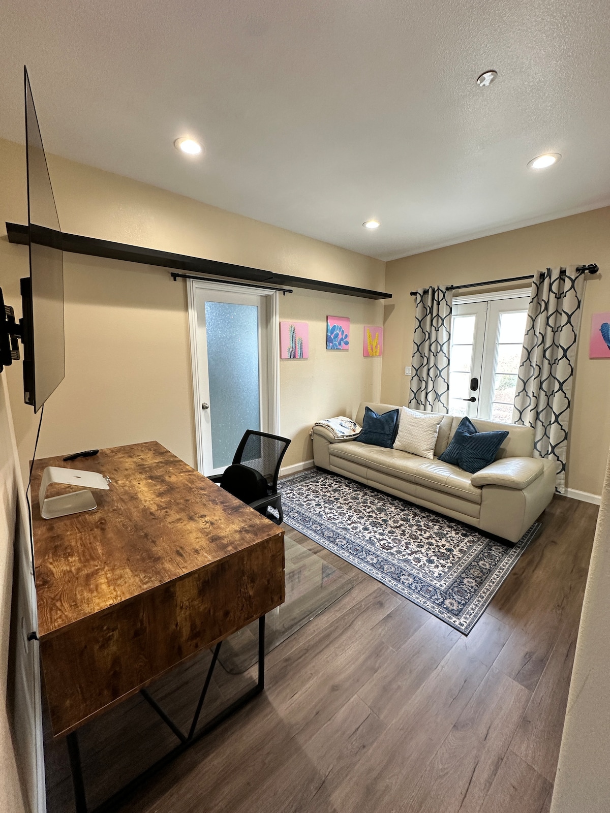 This modern loft is within walking distance to downtown's best bars and restaurants. It's also less than a mile from crypto dot com arena. The location even offers fast access to Dodger Stadium, The Greek, and Banc of California Stadium. Inside, is a large space with vaulted ceilings. Between the King bed in the bedroom and the sleeper sofa in the living room, up to 4 adults can sleep comfortably. 2 big screen TV's. One in the living room and one in the bedroom (which has a moveable stand).