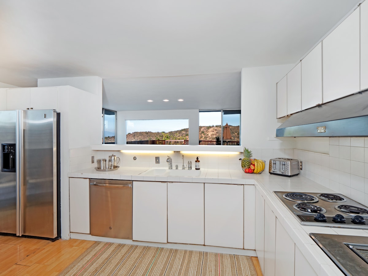 Midcentury modern 2bed/2bath stilt home with spectacular views above Sunset Strip (2 blocks up from Hollywood + Fairfax). Only blocks from the action, but very private and quiet. Recent renovations from roof to foundation, heat/AC system, 1 Giga/sec wifi, wired in + out with 11 speakers, movie projector + two 4k TVs (free Netflix, HBOMax and AppleTV+), 2-car parking with level 2 electric charger. Please note: No social gatherings or late, loud nights. Interior = 1015 sq ft. Deck = 300 sq ft.