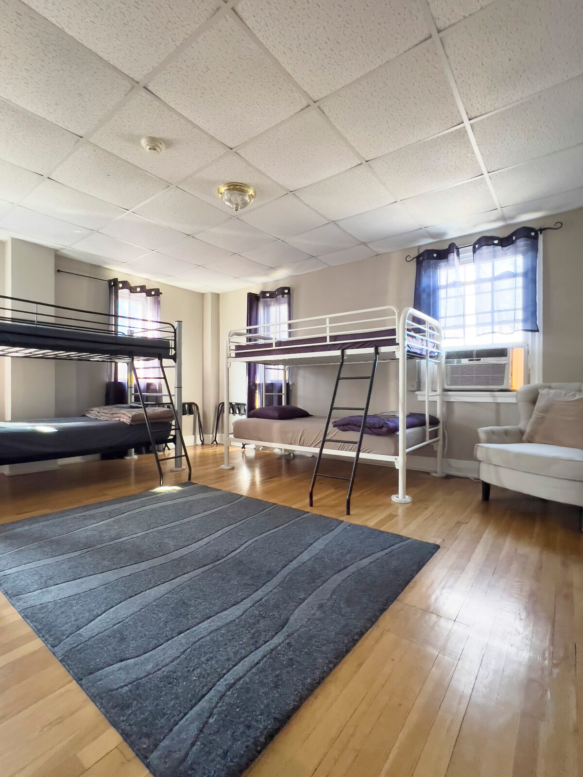 Quaint, affordable, comfortable, secure, clean accommodations for our guests and communal spaces to encourage a sense of connectedness and community. The space includes bunk rooms for groups as well as private rooms for individuals. We have two lounges, a library, and a large, full-sized kitchen with a refrigerator, stove, oven, microwave, and dishwasher. In addition, there are food storage areas and plenty of tables and chairs for seating—to eat or play board games!
