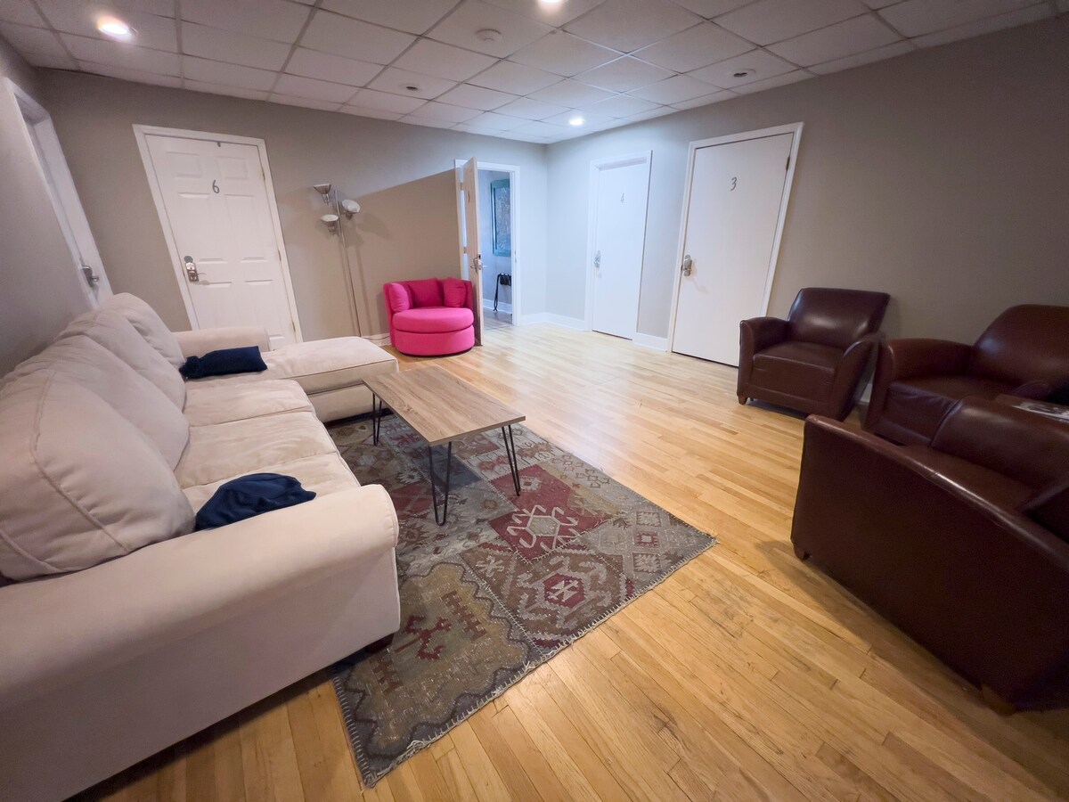 Quaint, affordable, comfortable, secure, clean accommodations for our guests and communal spaces to encourage a sense of connectedness and community. The space includes bunk rooms for groups as well as private rooms for individuals. We have two lounges, a library, and a large, full-sized kitchen with a refrigerator, stove, oven, microwave, and dishwasher. In addition, there are food storage areas and plenty of tables and chairs for seating—to eat or play board games!