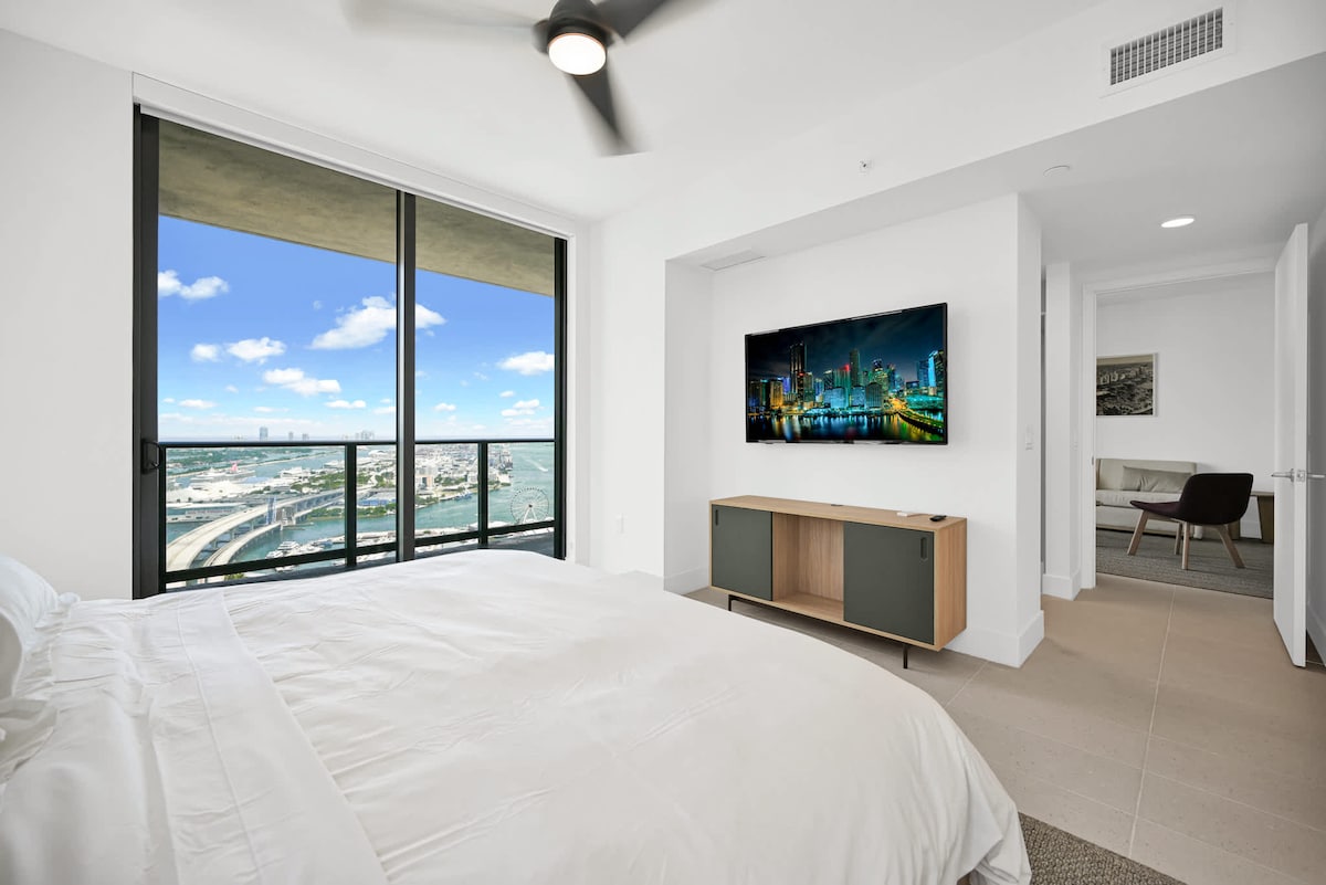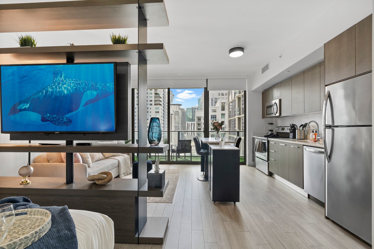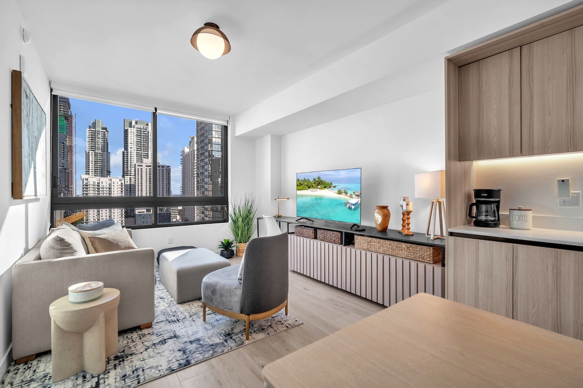 Modern Miami Studio with stunning views! Enjoy a cozy space with a King Size Bed, Smart TV, fast WiFi, and a private balcony. Perfect for relaxing after exploring the beach, nightlife, and top dining spots nearby. Located across the street from Bayside Marketplace Waterfront. Includes a kitchenette, central AC, and secure building access. Ideal for solo travelers or couples seeking comfort and style in the heart of Miami. Book your escape today 🌴