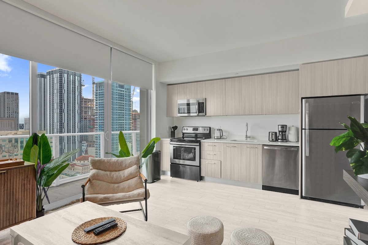FREE PARKING! NO RESORT FEES. Amazing location! Less than 5 minutes to PortMiami, 3 blocks to the Kaseya Arena, 1 block from Bayside Marketplace. Modern apartment with everything you need for an amazing stay in downtown Miami. A comfortable Queen bed for sweet dreams. Sofa Bed for 2 adults. Fully equipped kitchen with fridge, microwave, pots and pans, cutlery, dishwasher, and glasses. Washer and Dryer in the unit. Balcony. Amazing amenities with a Pool, 24x7Gym, SmartTVs + fast WiFi Internet!