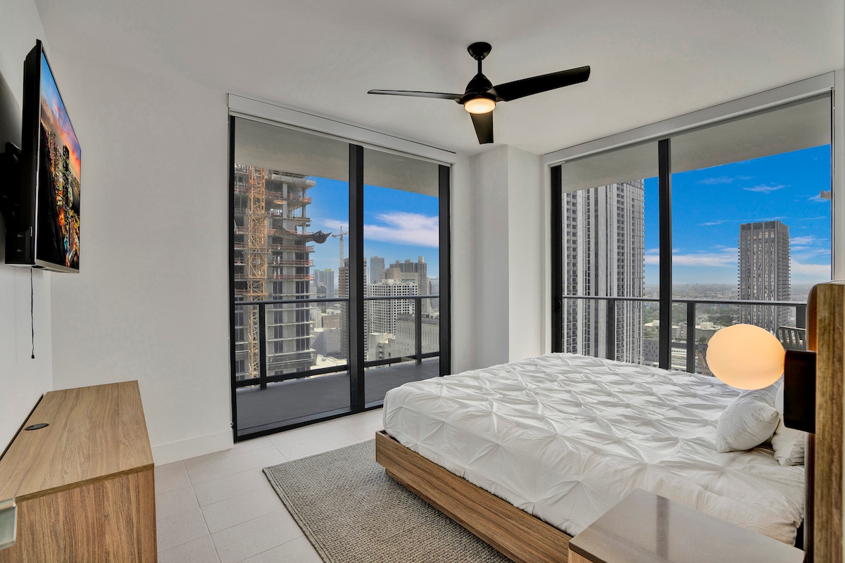 Experience modern luxury on the 50th floor! This newly designed 1BD penthouse offers breathtaking bay and city views through floor-to-ceiling windows that fill the space with natural light. The bedroom features a king-size bed, and the living room includes a comfortable sofa bed, perfect for up to 4 guests. Enjoy a fully equipped kitchen, resort-style pool, gym, and spa. Located in Downtown Miami, just steps from the city’s best dining, shopping, and nightlife.
