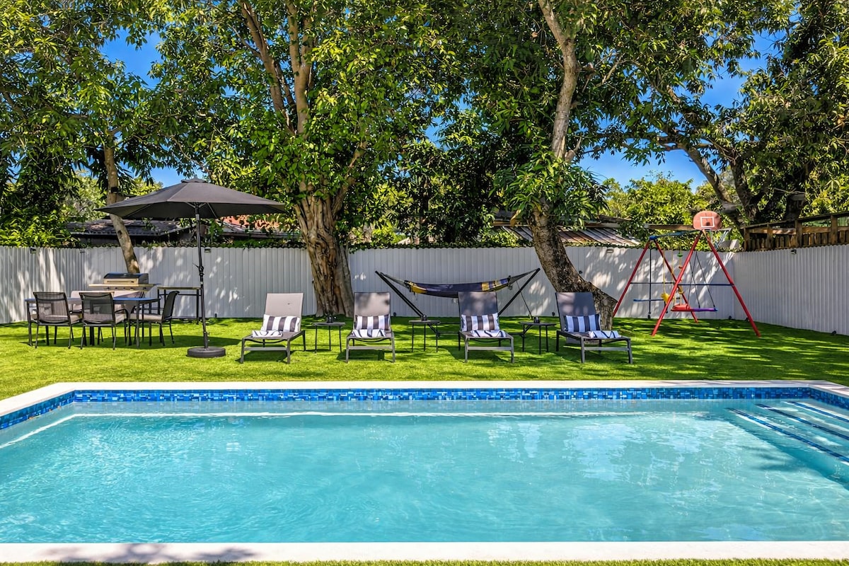 Bring the whole family and friends to this Tropical Miami Home with lots of room for gatherings and entertainment! Enjoy the entire house with a stunning backyard, salt pool and gazebo! FREE PARKING 12 Guests. 4 Bedrooms. 9 Beds. 2 Baths Patio: Large Salt Pool (child friendly) BBQ Grill, Fridge, Wine Cooler, Bar Counter, Outdoor Lounge Furniture, Mini Golf Area Rooms: Bedroom 1: 1 Queen Bed Bedroom 2: 1 Queen Bed 1 Twin Bed Bedroom 3: 1 Queen Bed Bedroom 4: 5 Twin beds & (Game Room)