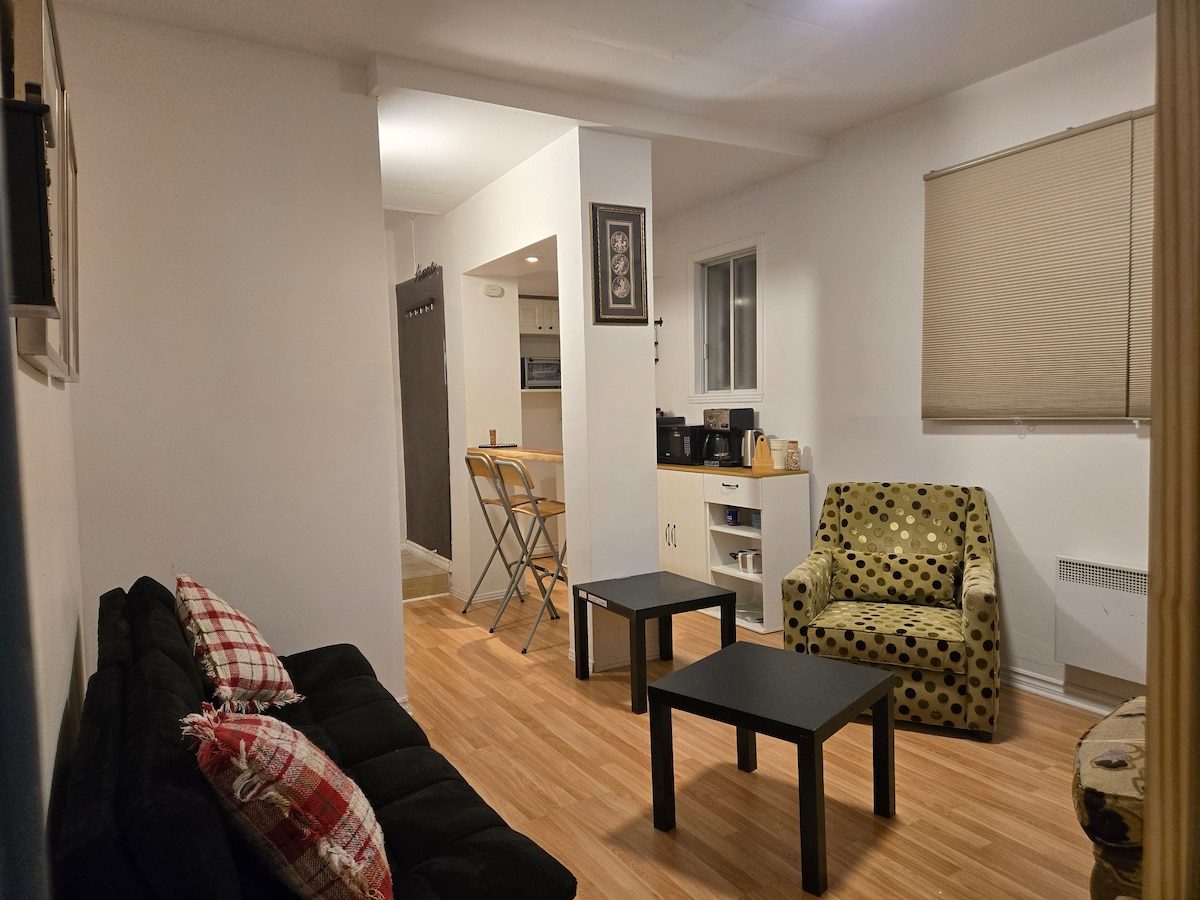Charmant studio situé dans un environnement calme et champêtre, près de toutes les facilités et pouvant confortablement accueillir 2 adultes. - Entrée partagée - Jolie terrasse - Accès à la piscine extérieure chauffée (mai à octobre) - Cuisine fonctionnelle et complètement équipée - Salle de bain avec douche et laveuse-sécheuse - Chambre à coucher confortable. Lit Queen - Station de Métro à 100 mètres - Plusieurs commerces à quelques minutes de marche