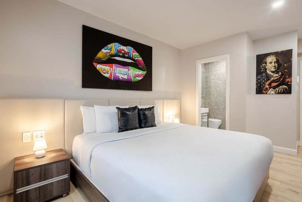 This elegant hotel room blends style and comfort, featuring a plush kqueen bed with premium linens. Located in one of Montreal’s most vibrant neighborhoods, you’re steps from cafés, bars, and cultural gems. Guests also enjoy access to a welcoming lobby lounge and a spacious basement with cozy seating, a pool table, and big-screen TV—perfect for work or relaxation.