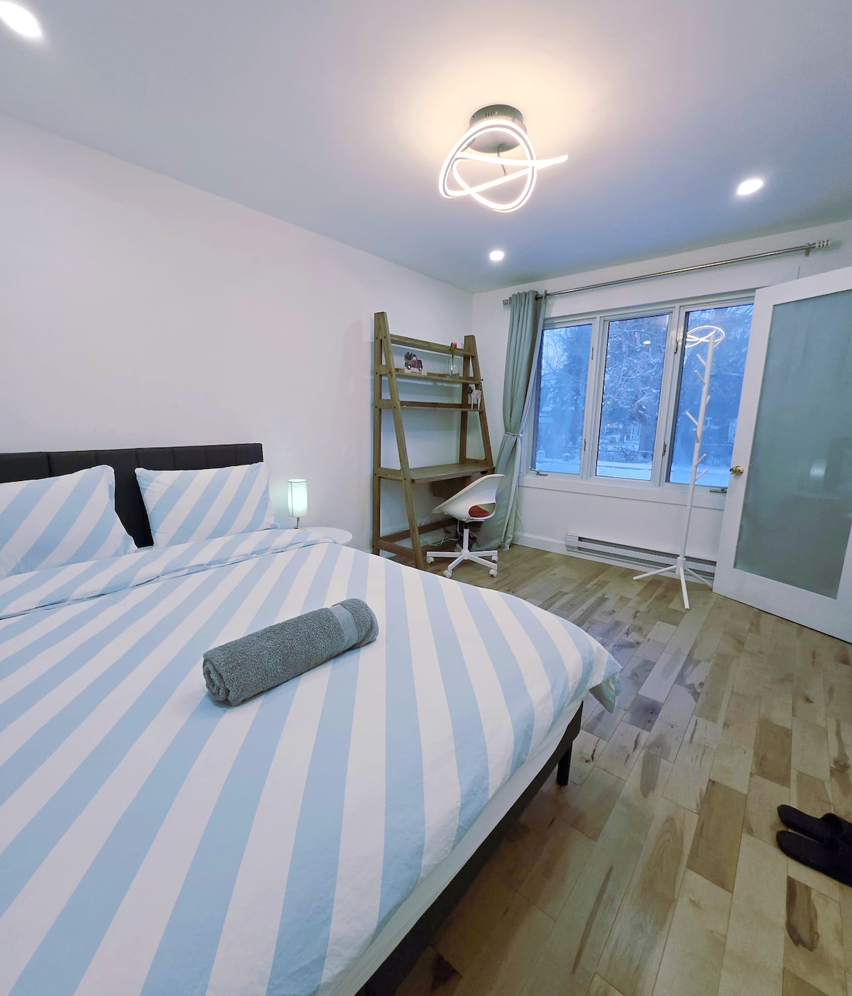 This stylish waterfront Airbnb offers a tranquil escape with views of both the serene water and a lush, expansive park. A spacious living area with sleek, contemporary decor flows into a fully equipped kitchen, ideal for cooking and entertaining. The bedroom is a serene retreat with soft linens and a minimalist aesthetic, ensuring restful nights. The combination of stylish interior design and natural surroundings makes this waterfront getaway the perfect place to relax and unwind.