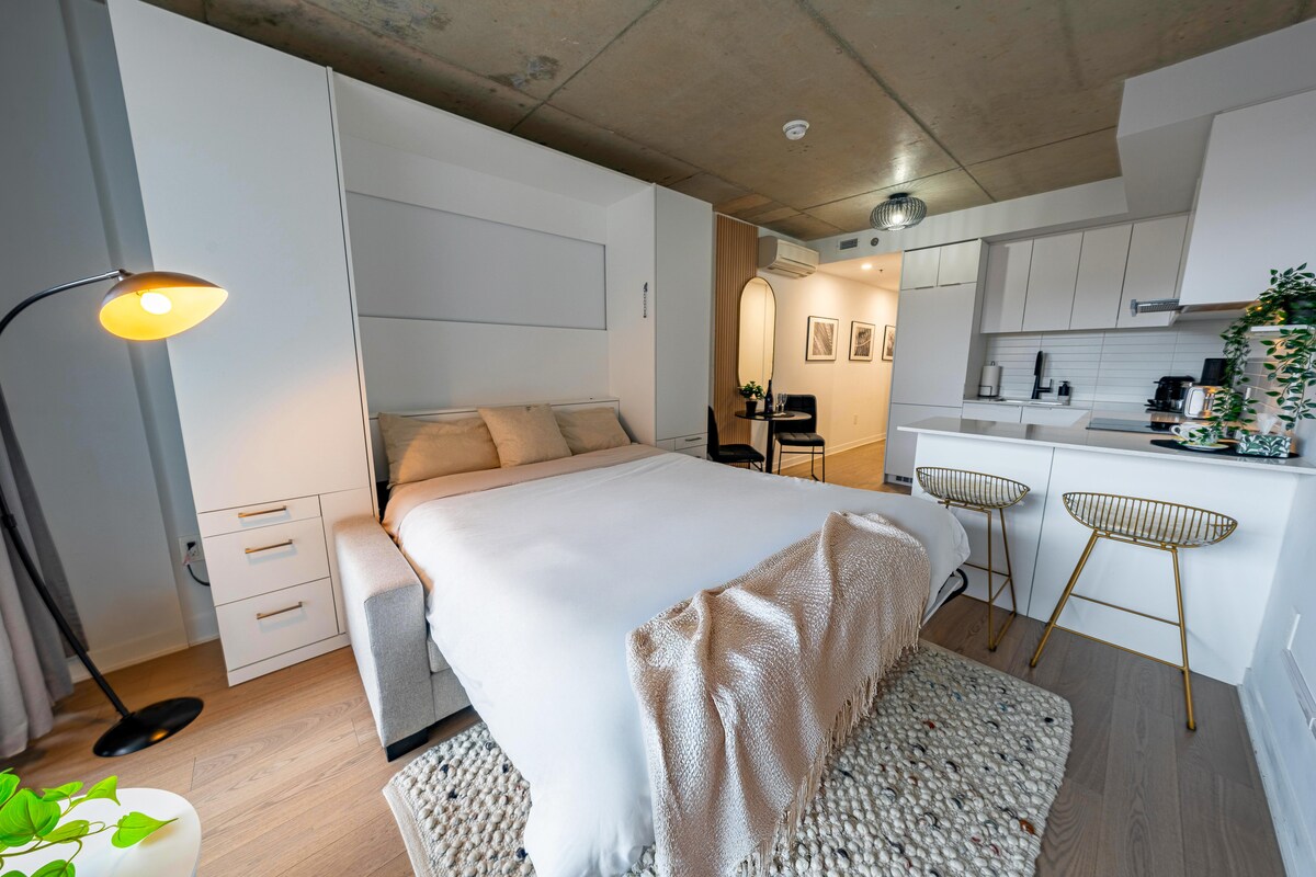 Charming, newly built studio in the heart of Montreal’s Quartier des Spectacles. Just a 5-minute walk to Berri-UQAM Metro and 10 minutes to Place des Arts. The studio features premium appliances and a Nespresso machine. Enjoy a queen-size Murphy bed, smart 42” 4K TV, and ultra-fast Wi-Fi. Relax on your private balcony overlooking the inner courtyard. Perfect for both short and long stays, with vibrant Saint-Catherine Street and local attractions nearby. Your ideal home base in Montreal!