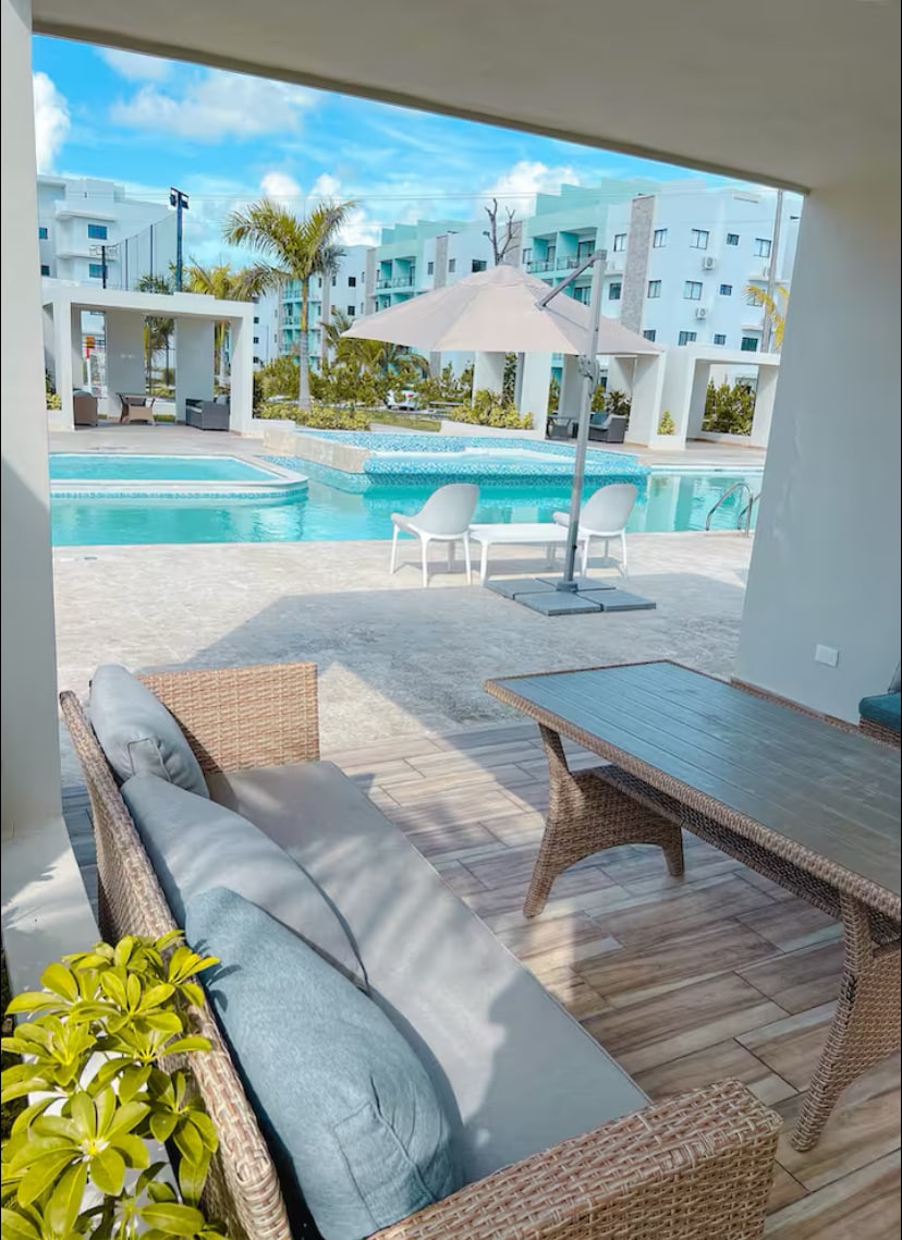 Enjoy a cozy stay in this 3-bedroom, 3-bathroom home in Downtown Punta Cana. Equipped with air conditioning, high-speed Wi-Fi, 2 Smart TVs, and a private terrace with a Picuzzi (no hot), it offers the perfect balance of comfort and convenience. The fully equipped kitchen, secure parking, 24/7 security, and large communal pool ensure a seamless experience. Just 3 minutes from Downtown Punta Cana and COCO BONGO, 12 minutes from the airport, and 15 minutes from the beach—book now!
