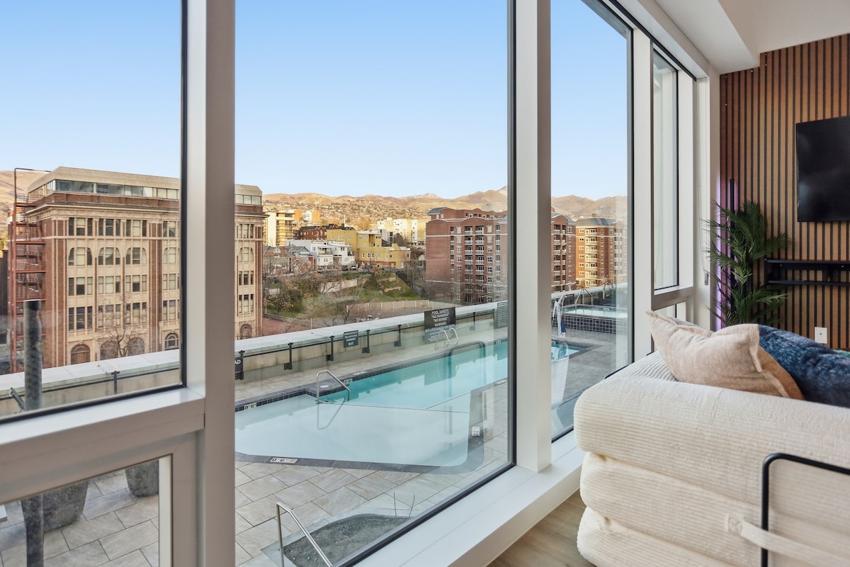 Nestled in the heart of Salt Lake City, this stylish retreat invites you to wake up to breathtaking floor-to-ceiling views. Just steps from world-class entertainment and dining, it’s a haven of comfort and sophistication. Sip your morning coffee with the city skyline as your backdrop, unwind by the fire pit, or challenge friends to a game of pool in the lounge. Every detail is designed to impress—perfect for a getaway where luxury meets convenience. Your urban escape awaits!