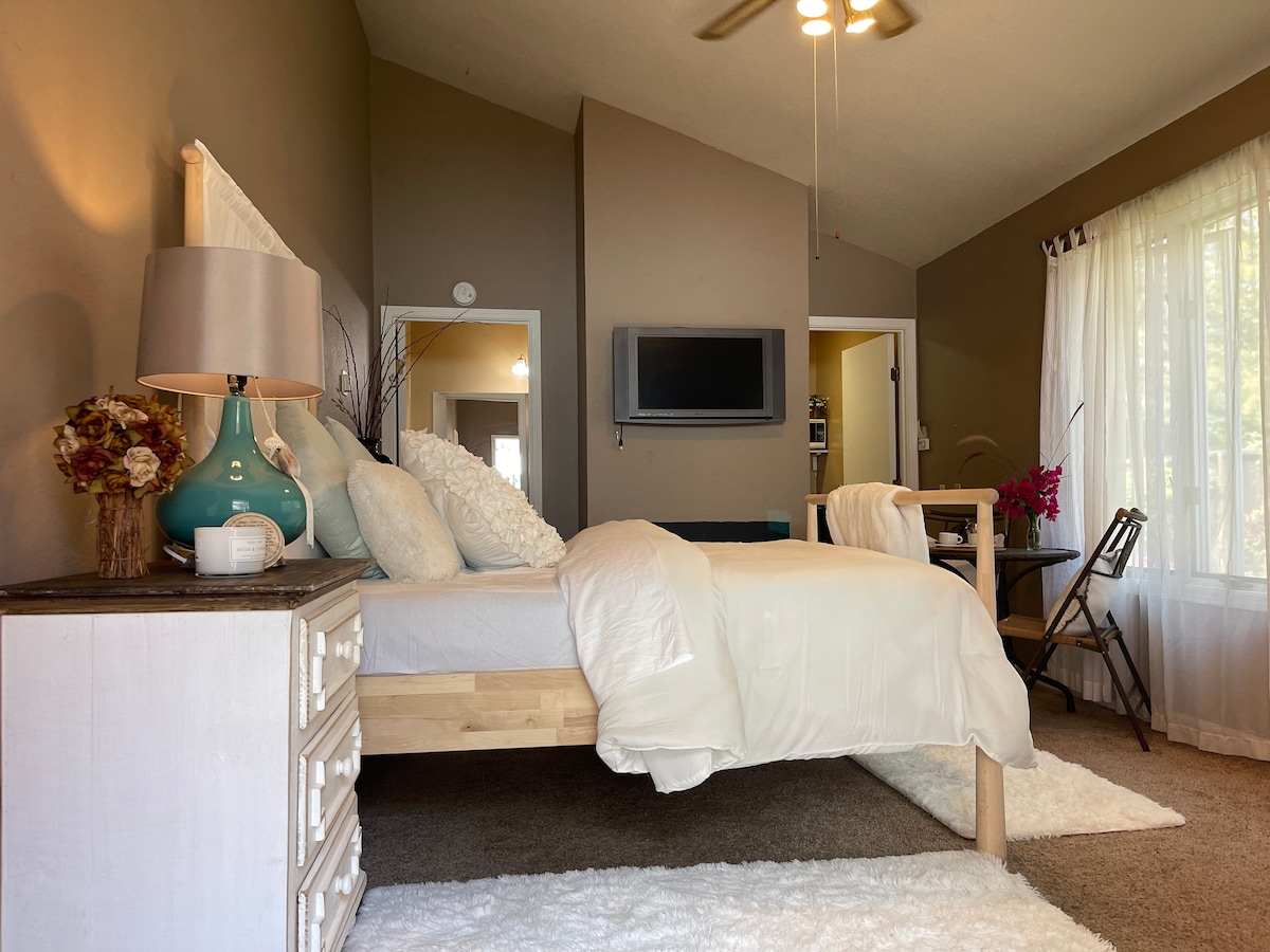 New construction 800 sq. ft. Cottage 1.1 miles to downtown Los Gatos. Off-street parking for one car. Cathedral ceilings with skylight (morning sun, nightly stars). Comfortable pillow top King bed. Single bed in same space for extra guest (extra $25 for third guest/night). Kitchenette with basics. Dining table for work spaces. Pool available for guests. Jacuzzi not available. Many quiet places on property to relax. We do not accept third party reservations. Add your guests on reservation.