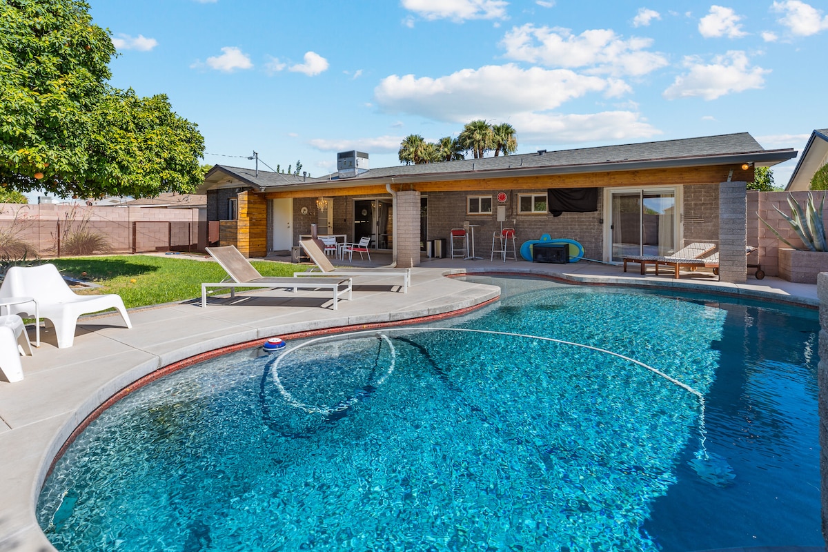 Ideal location & fabulous pool in this roomy sunlit retreat with AC! Large pool/spa/kitchen. Great yard and huge covered patio. Cheap uber to Old Town, attractions, nightlife, dining, and unique shops. Walkable to grocery store. Fast Wi-Fi speed! Stream favorite movies/sports on the 75" smart TV's. Enhance your stay with the optional heated spa ($50/day) or the heated pool + spa option ($100/day). Valid ID requested upon booking. Reserve now! TPT license #21511410 Scottsdale License #2028375.