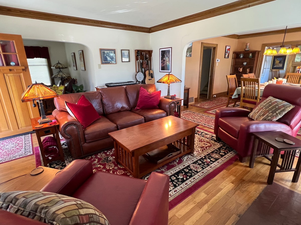 You and your family will love the relaxing vibe of the Mission Arts and Crafts style furnishings, 4 luxurious bedrooms, library, large dining room, dedicated office space and super fast WIFI! The living room has an electric fireplace, 55” smart tv, and musical instruments to play! Bathroom has an antique clawfoot tub/shower, and there's a large fully equipped kitchen. Central AC, laundry, outdoor grill. Excellent access to light rail & restaurant, 6 minutes to T Dome & Convention Center.