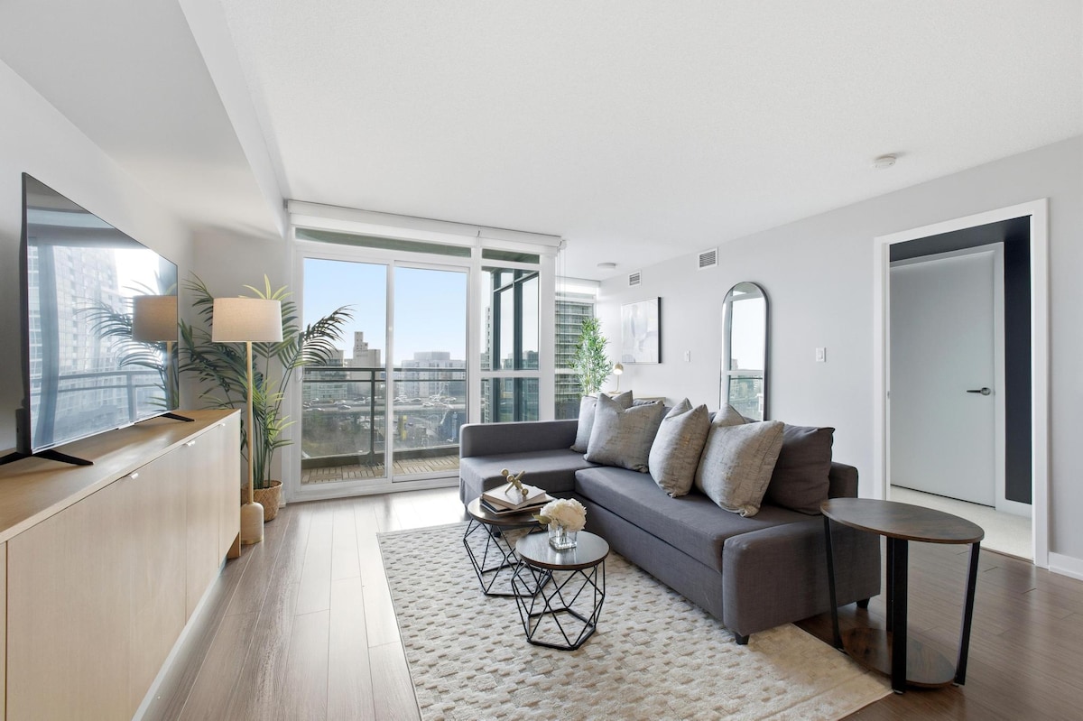 Experience downtown Toronto in this stylish 1-bedroom suite in the heart of CityPlace. Perfect for families or groups of up to 5, the unit features a King bed, a double bed, and a comfortable sofa bed. Enjoy a 55-inch TV, a fully equipped kitchen, and a private balcony with city views. Located steps from the CN Tower, Rogers Centre, and the vibrant waterfront, this is your ideal urban base. Please note: paid public parking is available nearby as no on-site parking is included.