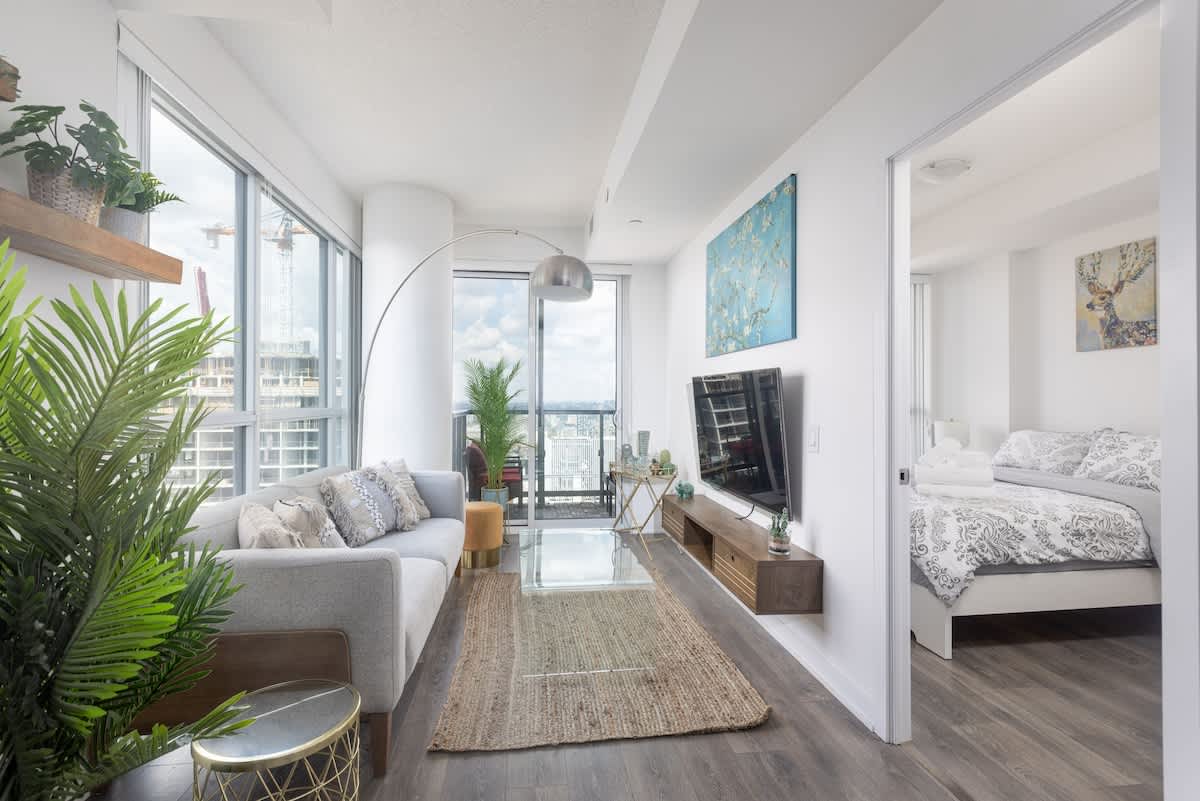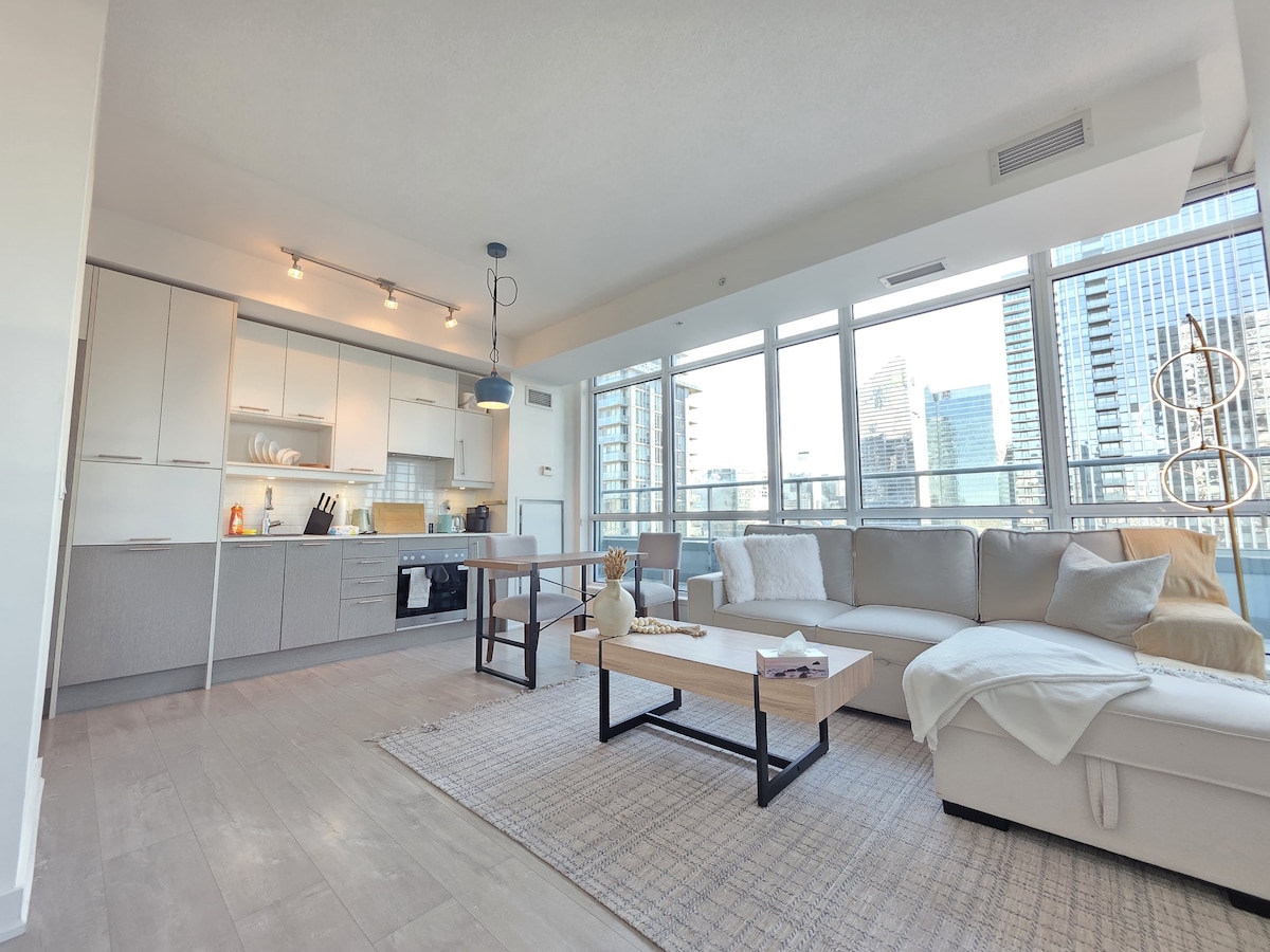Welcome to your cozy urban retreat in the heart of Toronto! This modern and stylish 2-bedroom condo is situated in the vibrant entertainment district, offering you the perfect blend of comfort, convenience, and contemporary living. The living room is tastefully furnished with a comfortable sofa, perfect for unwinding after a day of exploring the city. Enjoy your favourite shows or movies on the 65" smart flat-screen TV equipped with streaming apps for your convenience.