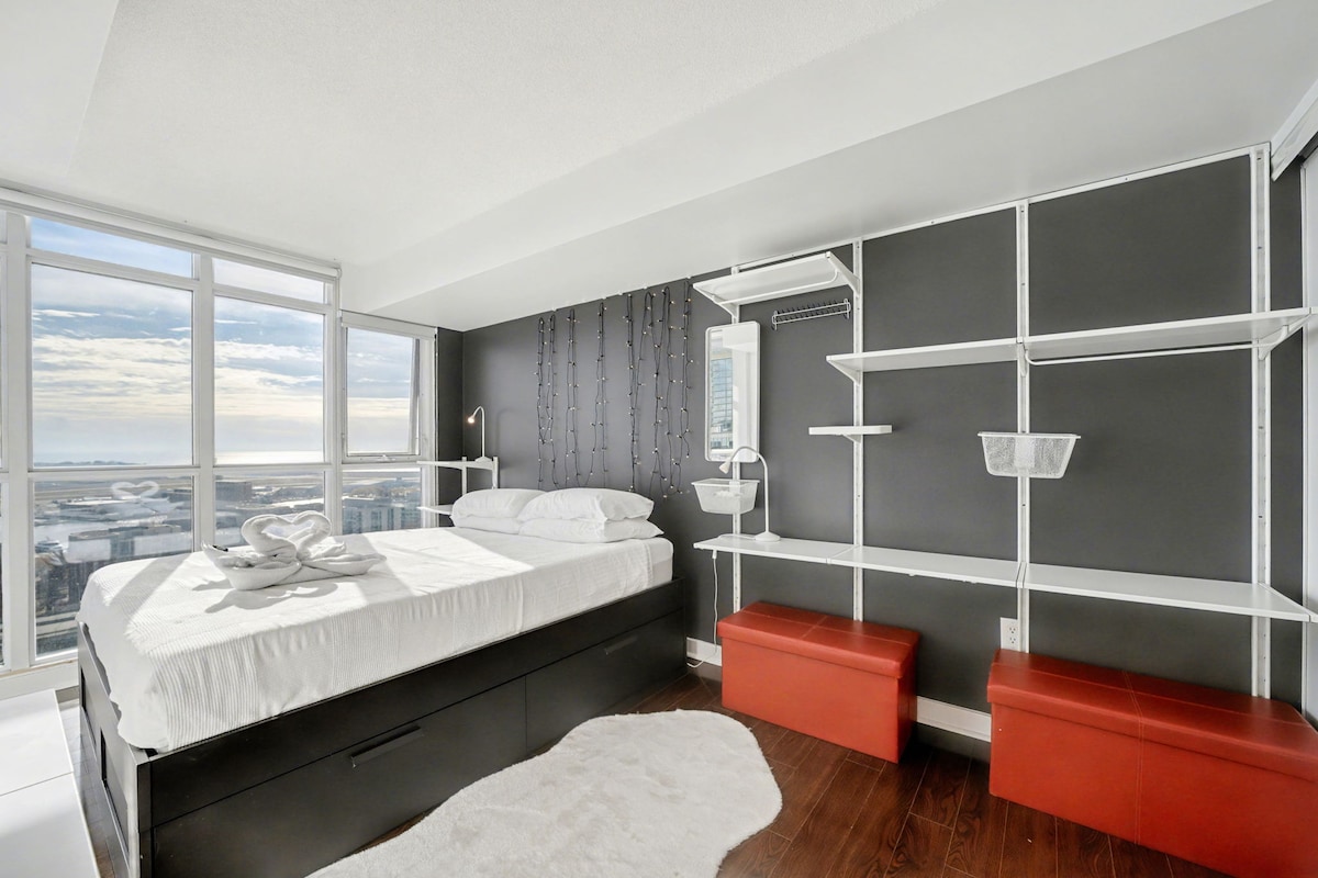 Enjoy a stylish experience at this centrally located condo. Our place is 5 minutes from the lake and amazing attractions such as Scotiabank Arena, Ripley's Aquarium, CN Tower, Rogers Centre and so much more. Just steps from Union Station and the underground PATH system. This condo is great for travellers, tourists and business trips. The Space Our condo is located on the 51st floor with Hi speed wi-fi, Smart TV with Netflix, toiletries, hair dryer, kettle, iron, washer/dryer and so much more.