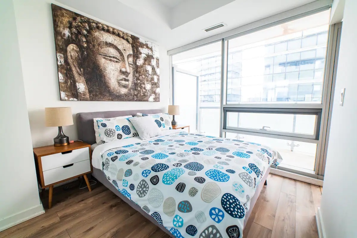 Brand new, modern, and stylish condo in the heart of downtown Toronto. Large balcony with a view of the lake. 3 minutes walking distance to Rogers Centre, Scotiabank Arena, CN Tower, Aquarium, and Waterfront harbors. 3-minute walking distance to train, bus, subway, and airport shuttle station. Safe, secure, and easy self-check-in procedures with building security. Netflix and YouTube on 65" Smart TV. Free WiFi, in-suite washer and dryer.