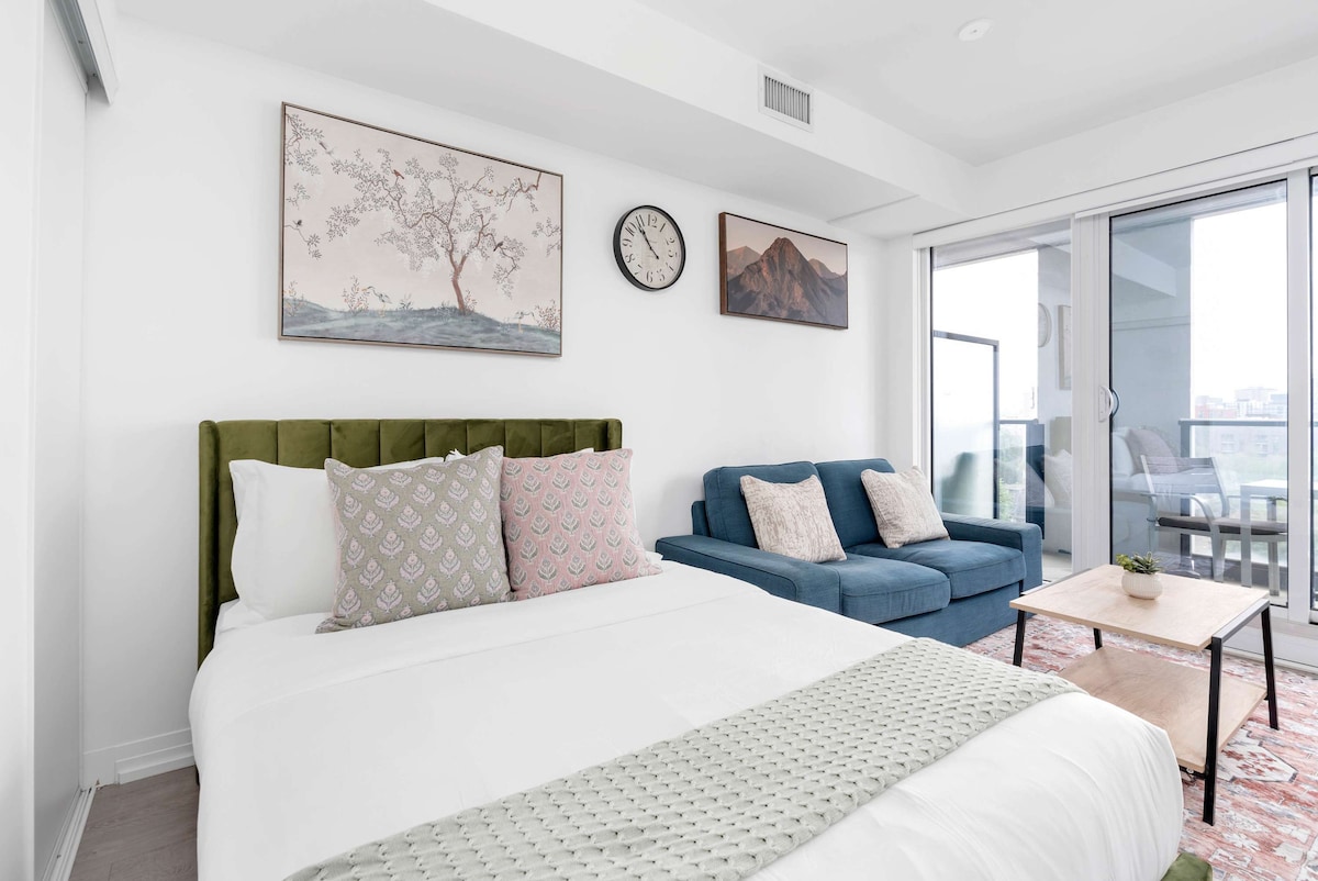 A bright and stylish urban loft in the heart of downtown! This sun-filled suite features soaring 12-ft ceilings, stunning floor-to-ceiling windows, and sleek hardwood floors. Relax on the oversized sofa, dine at the modern table, and cook in the fully stocked kitchen with stainless steel appliances. Sleep soundly on a plush Westin Heavenly queen bed, and refresh in the spa-like marble bathroom. Includes in-suite laundry, high-speed Wi-Fi, and an unbeatable location near vibrant King Street West!
