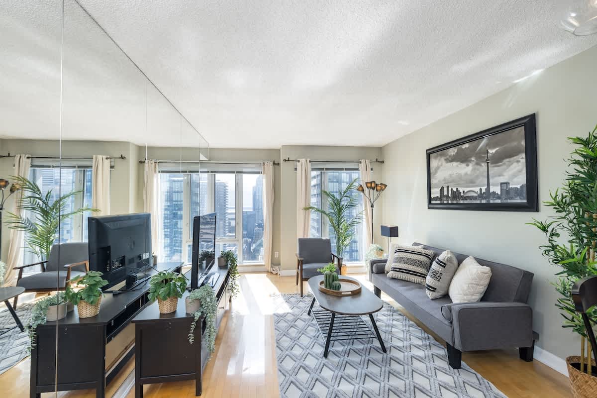 Imagine waking up to the breathtaking sight of the CN Tower piercing the skyline, its reflection dancing on Lake Ontario. After a day exploring Toronto's vibrant streets and visiting landmarks like the Rogers Centre, the Scotiabank Centre & the magical Ripley's Aquarium, unwind in the living area with panoramic views, or stroll to nearby restaurants and nightlife. Equipped with basic cooking and dining utensils, towels, linens, and bath essentials. Catch your favourite show on the smart TV.