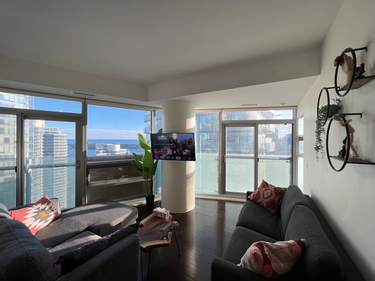 Situated on the 30th+ floor with floor-to-ceiling windows, you'll have the perfect view of the CN Tower, Rogers Center, city, and lake. The fourth photo in the gallery is the actual view taken from the room. Located in the heart of downtown. Minutes walk from the CN Tower, Rogers Centre, ACC, waterfront trails & Union/Train Station + PATH for convenience. 65" Smart 4K TV with Netflix and YouTube. Contemporary, quiet, and perfectly central location for your Toronto getaway
