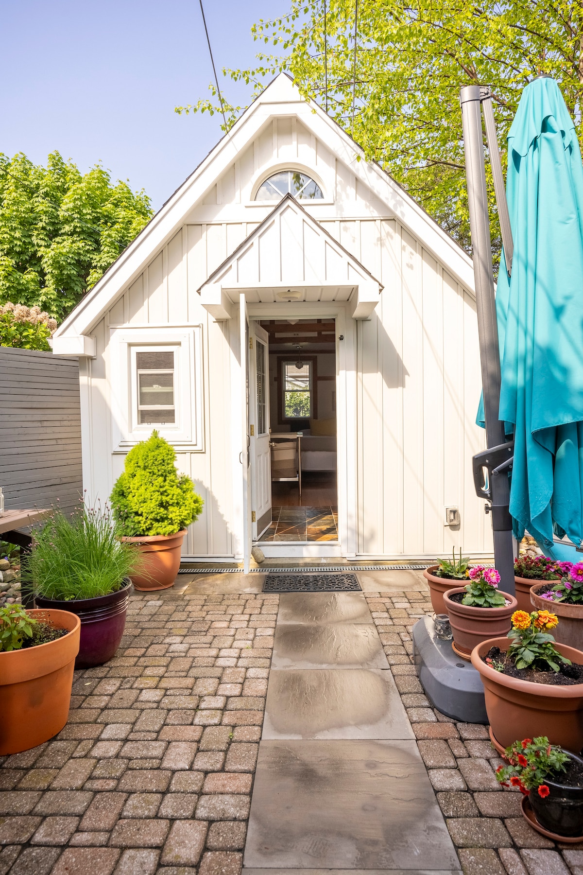 This separate, minimalist, self-contained coach house is a perfect quiet escape for one, and can also intimately accommodate two persons. Wake up in natural light with all the essential home comforts: premium queen-size mattress, hypoallergenic, 100% cotton linens, a private bathroom, toiletries and meal preparation basics. No kitchen. Nearby options for prepared meals, groceries + delivery. No TV. No housekeeping fees. A 20-minute getaway from the downtown core near the lake in the east end.