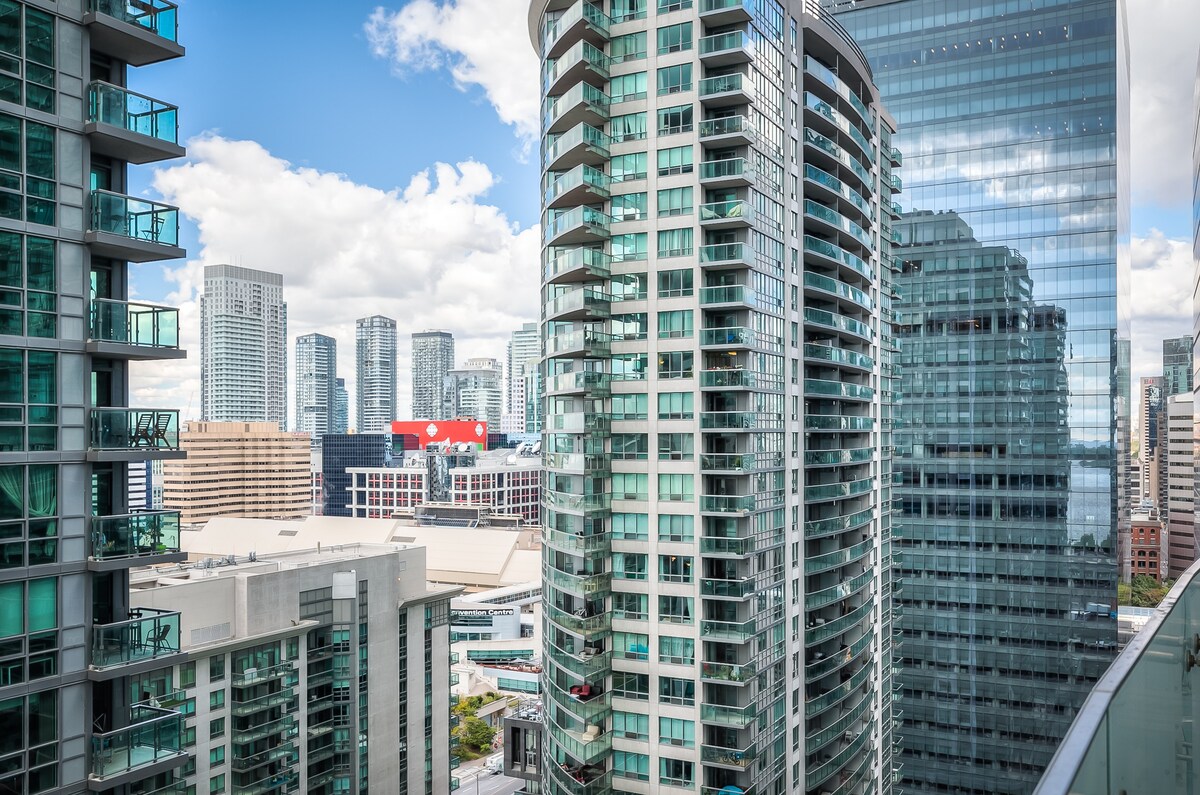 Cozy 2 bedrooms + 2 full baths condo in the heart of downtown tourist hotspot; unobstructed CN tower view; 1 free dedicated parking. Perfect for business or vacation stay! WALKING DISTANCE to: • Supermarket & LCBO: 1 min • Scotiabank Arena: 3 min • Union Station: 3 min • Convention Center: 3 min • Ripley's Aquarium: 3 min • UPX Train: 5 min • Harborfront: 5 min • CN Tower: 5 min • Rogers Center: 7 min • Roy Thompson Hall: 9 min • Royal Alexander Theater: 12 min • St. Lawrence's Market: 18 min