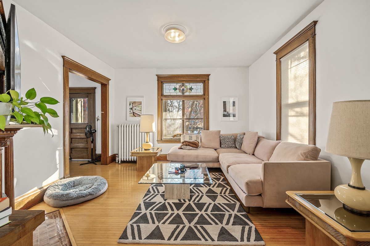 Designer-owned Uptown hideaway just 1 block from LynLake! With off street parking. Walk to top spots like Hola Arepa, The Lynhall, or Lake Harriet. Enjoy a private Queen bedroom, full-size daybed, washer/dryer, separate heat/A/C, and a fully stocked kitchen. Stylish decor and beautiful natural light throughout. Only 15 mins to MSP Airport. One dog is allowed at the property with a fee. Message for approval on a second dog. Perfect for a cozy, walkable stay in the heart of Minneapolis.