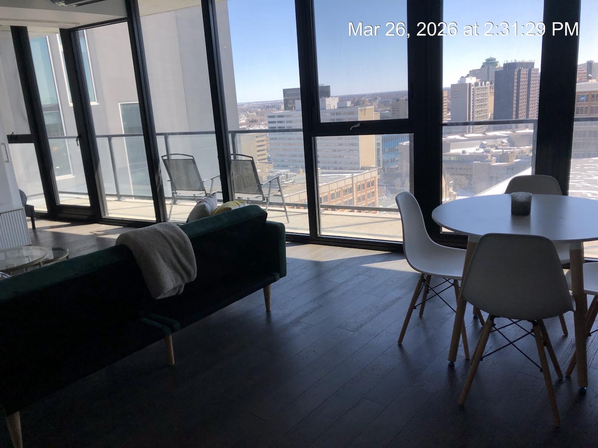 Enjoy a stylish experience at this centrally-located condo. Private balcony Overlooking Jets stadium!You'll have views from your private balcony of all the fun that is downtown Winnipeg. The rooftop patio overlooks the beautiful downtown area and is a great place for a cozy fire or photo op.Centrally located and walking distance to dining, shopping, and MetLife stadium. Our rooftop offers 360 degree views of the city. Enjoy a relaxing stay in one of the most desired locations in all of Winnipeg.