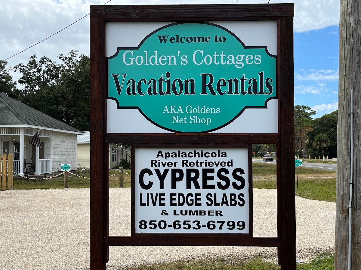 The River Cottage at Golden's Cottage's Vacation Rentals is just a short 2 blocks to the Apalachicola Bay and boat launching areas known for great fishing. Open floor plan with 1 king Beds, Smart TV, Coffee bar, Microwave, Mini Fridge, Dinning for two, Private Bathroom, and Large Private Deck. Free Vehicle and Boat Parking on site. Shared Grilling Area with Picnic Tables and Fire Pit. One of three cottages on property, Great for Families. Come Have a "Golden" time on the Forgotten Coast.
