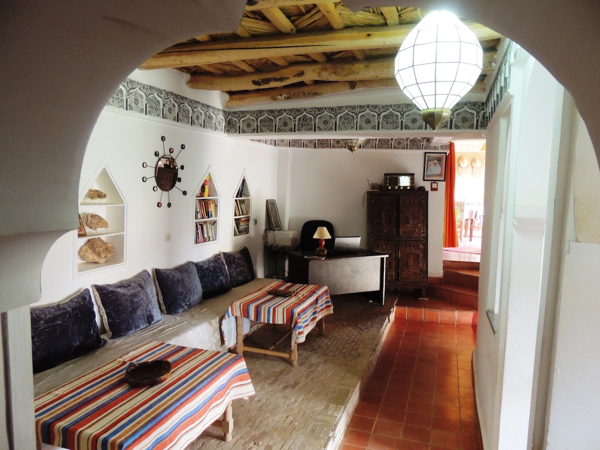 Located in the palm grove of Ouarzazate this small house of Berber style will enchant you for its charm and comfort. Calm, relaxation, meetings with our animals are guaranteed. With swimming pool and garden shared with other travelers. Breakfast included, air conditioning/heating, wifi, terrace and free secure parking. A bedroom with 1 double bed + 3 single beds. A convertible living room with 2 single beds and an equipped kitchenette. Ideal for lovers of nature and authentic.