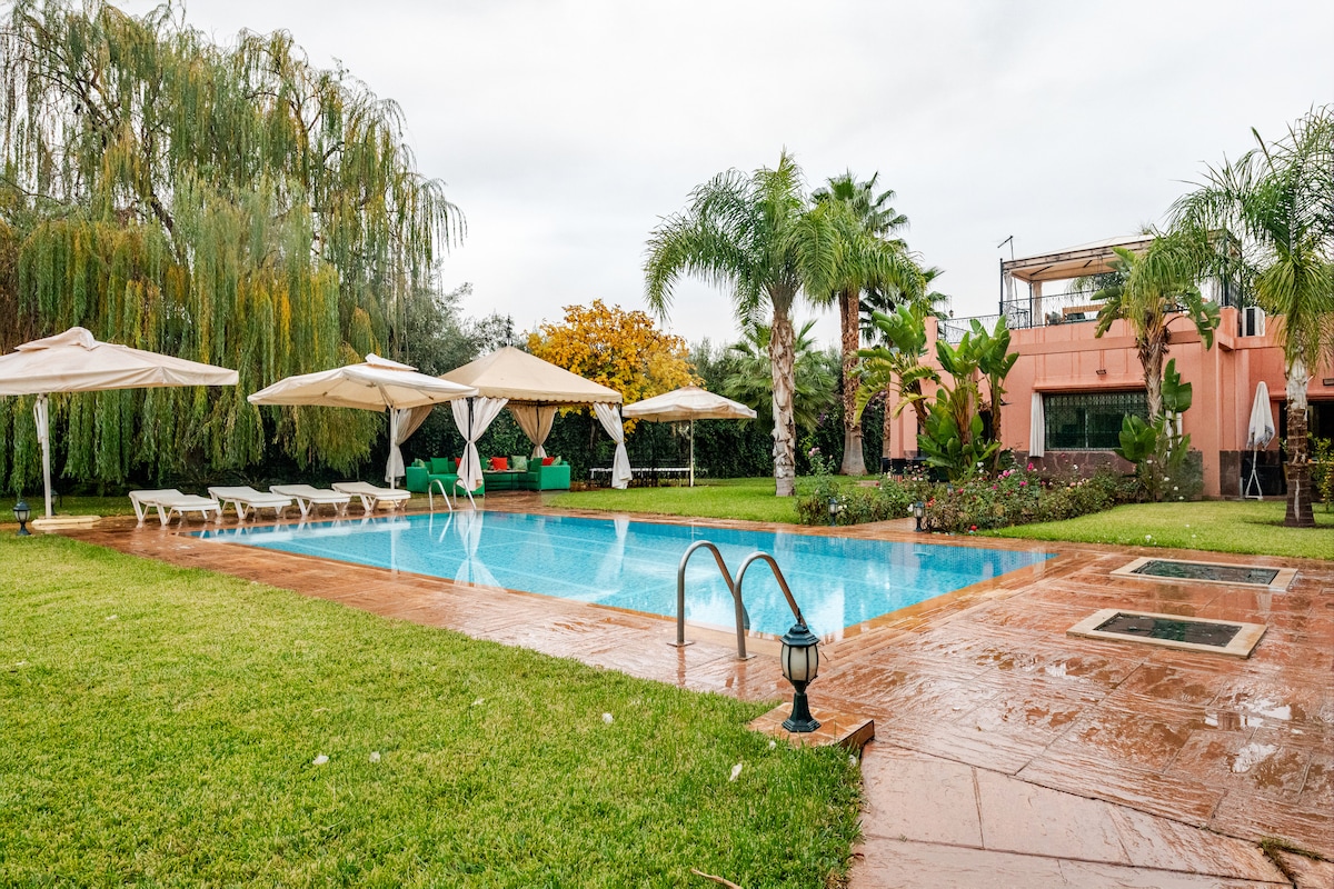 Grande maison avec Piscine, pour se retrouver en famille ou entre amis, jusqu’à 13 personnes. En toute tranquillité. Gardiens sur place à votre disposition . Il y a 5 chambres et 4 salles de bain , une cuisine , un grand espace salon intérieur avec une grande cheminée et un grand espace repas l hiver . Espace repas également dans le jardin l été . Une grande terrasse panoramique d où l on peut voir la chaîne de l atlas et le coucher de soleil .