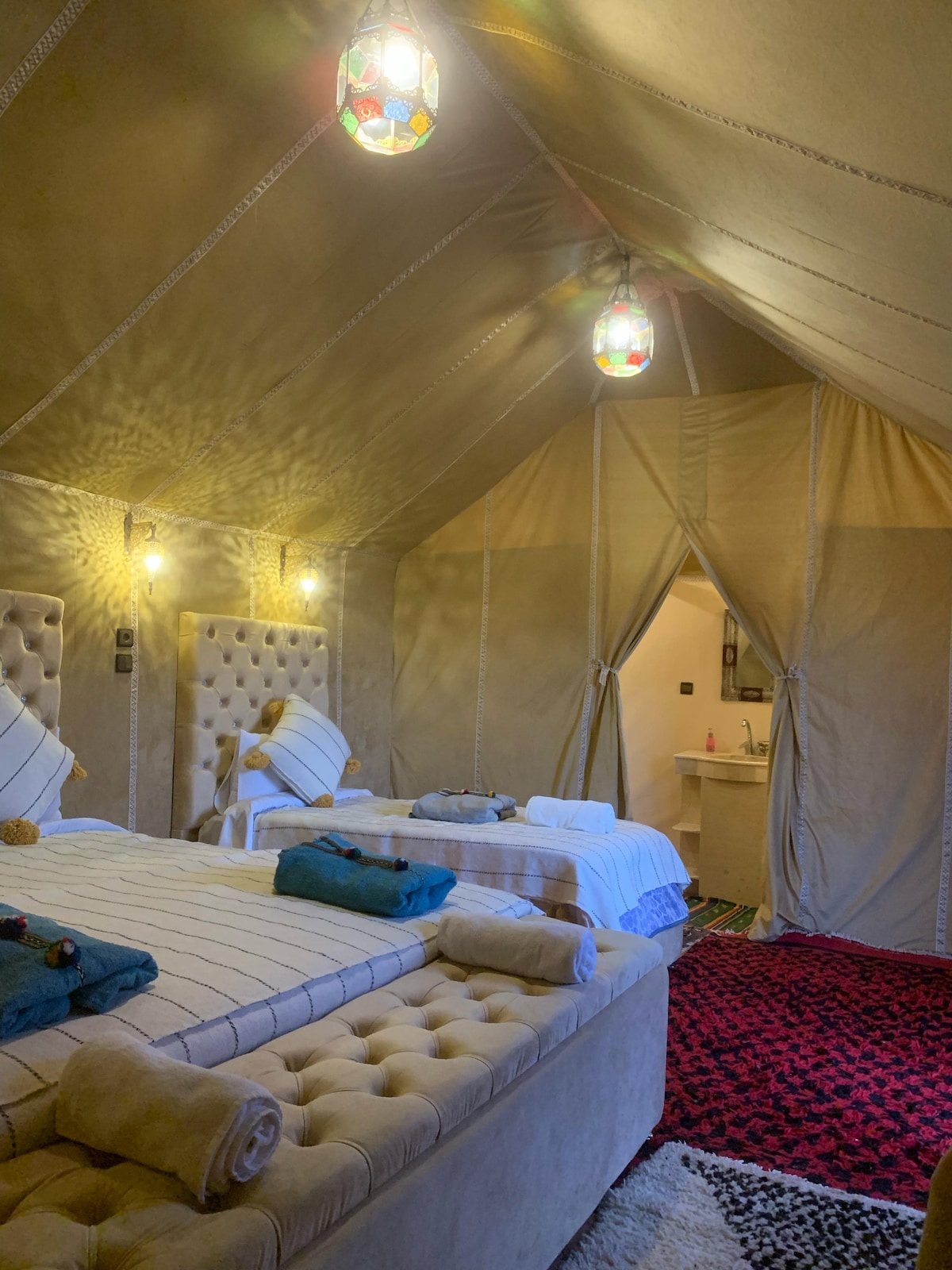 My luxury tent in Merzouga is an extraordinary oasis nestled amidst the mesmerizing dunes of the Sahara Desert. Surrounded by breathtaking landscapes, this unique accommodation offers unparalleled views of golden sands stretching as far as the eye can see. Inside, my spacious tent is adorned with exquisite Moroccan decor and equipped with all modern comforts—plush bedding, a private bathroom with hot water, and air conditioning for those warm desert nights.
