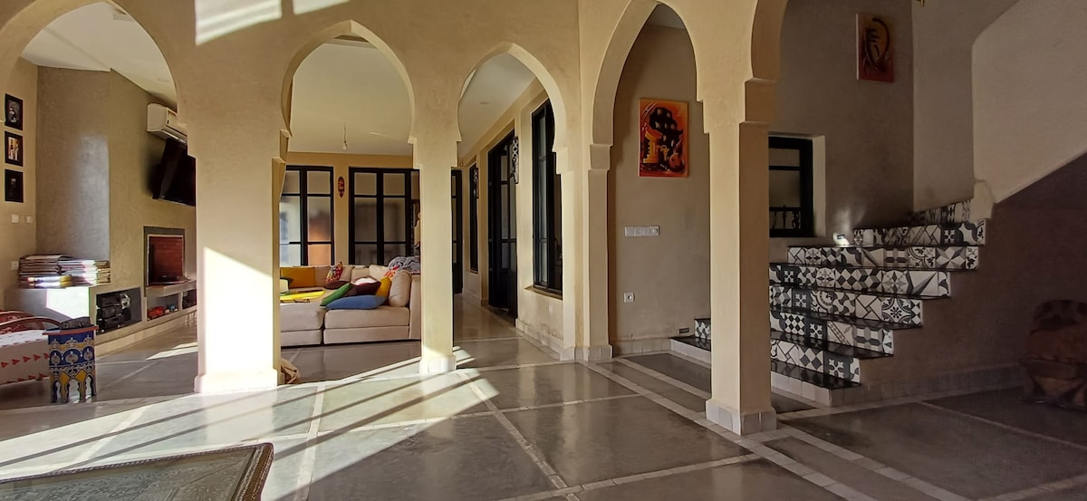 Discover Moroccan charm in a traditional villa with a private pool. Located downtown, it offers peace, comfort, and authenticity. Each bedroom has a private bathroom. Spotlessly clean and tastefully decorated like an art gallery. Homemade breakfast included daily. Ideal for exploring kasbahs, the desert, and film studios. Perfect for families, couples, or friends. Wi-Fi, equipped kitchen, terrace, garden, and easy-access garage for 2 cars.