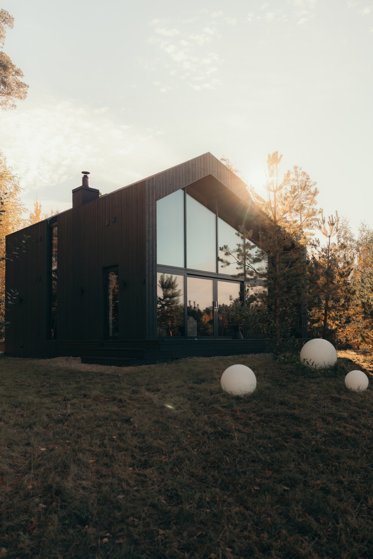 Hilltop tiny house in Amatciems with floor-to-ceiling views over forest and lake. Open-plan living with fireplace, fully equipped kitchen and a terrace for your sunrise coffee. Lake access, and village quiet hours for deep rest. Perfect for couples, friends or families seeking a calm, design-led escape.