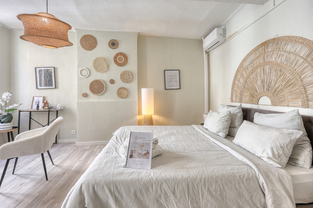Settle into our spacious 57 m² apartment, located in the heart of the medieval city, in a fully pedestrian area. Here, peace and authenticity await you. - Bedroom with a queen-size bed (160x200) and high-quality bedding - Bright living room with a sofa bed (150x200) - Fully equipped kitchen (stovetop, oven, microwave, coffee maker, kettle...) - Free Wi-Fi, television, hairdryer, fans - Mosquito screens on the windows for added comfort (no air conditioning)