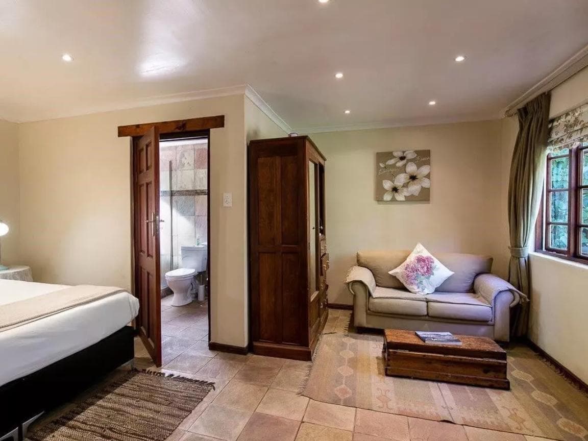 This comfortable 6-sleeper garden cottage is next to the pool and has 1 double bed, 2 single beds in the loft and a double bed in the lounge. The unit has a well-equipped kitchenette, a full bathroom, and a spacious lounge with a TV.