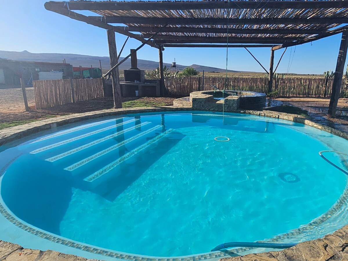 Against the mountains, this small laid back camp is rustic & charming, a retreat. For couples, families, besties or small groups. A secret spot with access to breathtaking views. 2 sleeper camping tents with supplies (Glamping pods available, ask us) bedding, utensils, braai stand, shower, hot tub, sauna, free massage, picnic basket, firepit, pizza oven, film screening A short hike/drive leads you to a waterfall, for a refreshing dip or picnic. Explore scenic trails. Bring your bike or hike.