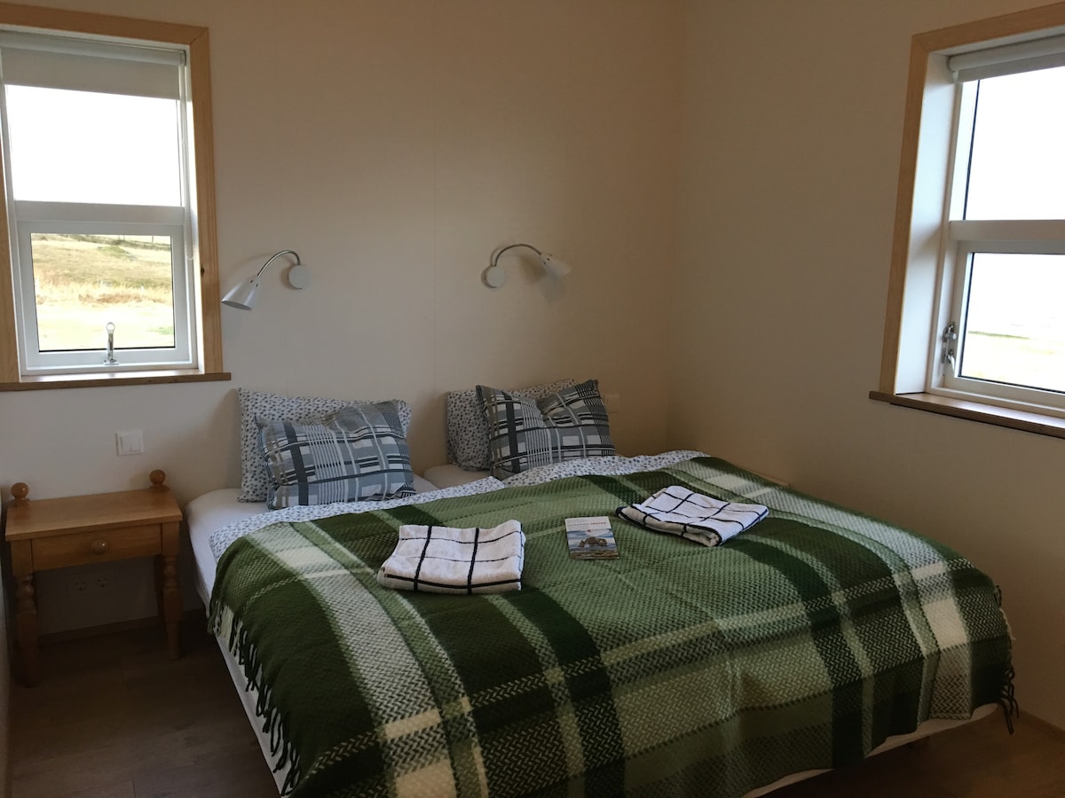 Brand new cozy cottage 52 m2 with two bedrooms, set with in our farm Hraunháls on Snæfellsnes peninsula. Between Stykkishólmur (20km) and Grundarfjörður (20 km). The cottage has all basic necessities, stove with oven, kettle, coffee maker, toaster, fridge and freezer also washing machine, smart flat screen and free Wi-Fi. There’s a nice patio around the cottage where you can enjoy the beautiful nature and view, listen to birds singing in the summer and spot the northern lights in the winter.