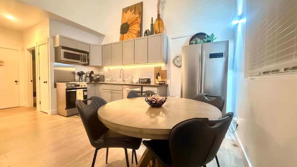 This new modernized apartment comes with a huge Gym, Pool (pool is CLOSED for the winter season, it opens up again in May), Hot Tub (open all year round), Luxury Clubhouse w/ a Pool Table and Shuffle Board, BBQ Grills, Firepits, Pickle Ball Courts, Designated Workspace with High Speed WiFi, AND a Full Kitchen that comes fully stocked w/ cookware, utensils, coffee, and other kitchen essentials. The mounted 55" Roku TV gives access to all your favorite streaming apps.