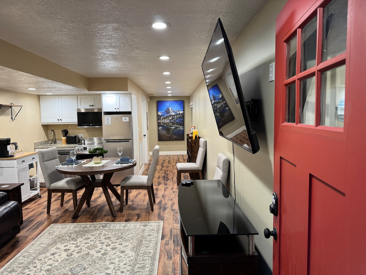 Discover an idyllic Utah retreat, perfectly situated near ski resorts & trailheads. Indulge in a private 2,500 sq. ft. basement apartment with a separate entrance, featuring 2 bedrooms, 1 Jack-n-Jill Bath, a Kitchenette, a Gym, a Theatre, and awe-inspiring postcard views. Bedroom #1 offers a king bed, while Bedroom #2 features a king bed and 2 adjustable twin beds that convert to King. Enjoy SmartTVs in every room, unwind in the gym or theatre, and cozy up by the fireplace for pure relaxation.