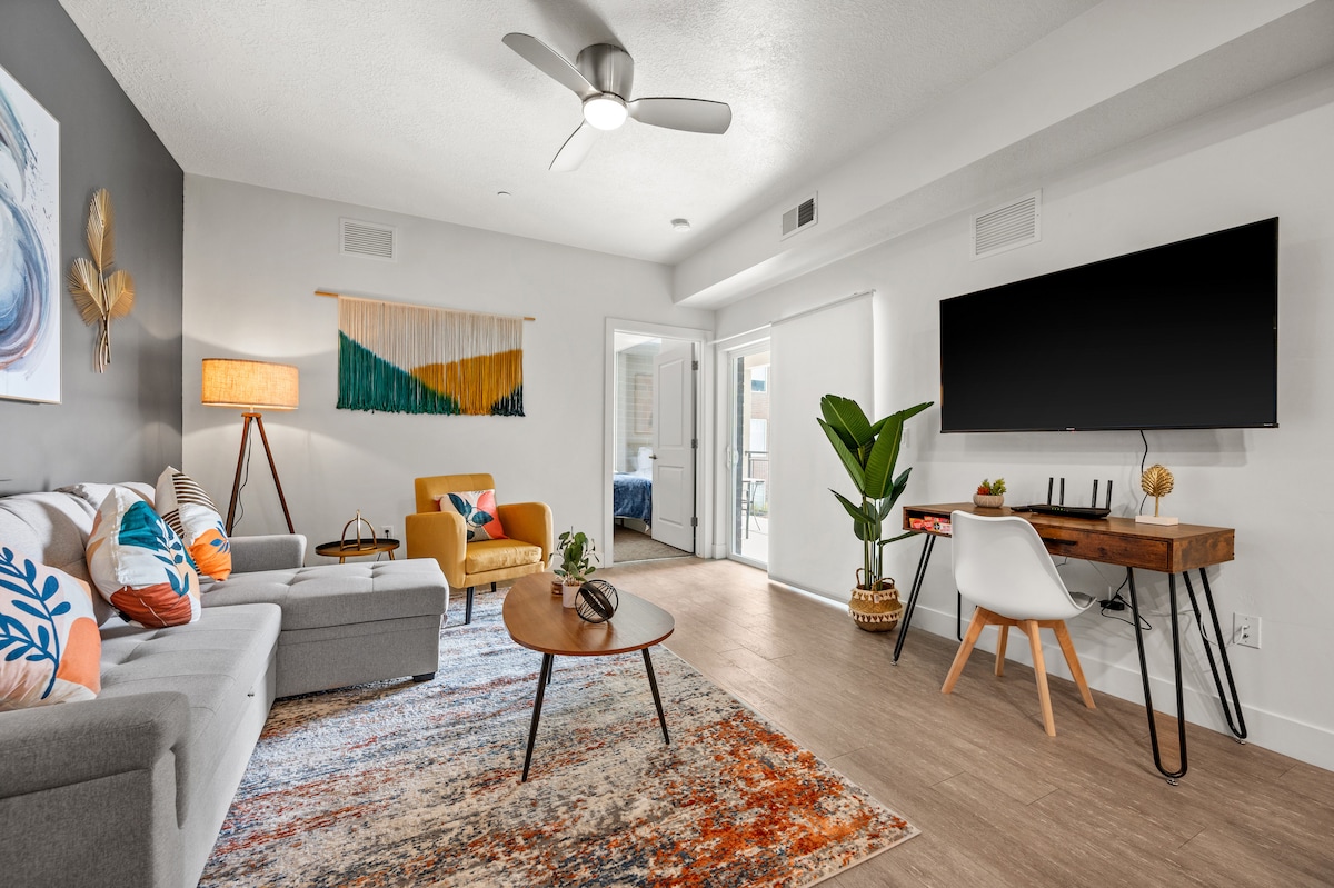 Experience luxury in our spacious apartment located in the heart of SLC. Enjoy stunning mountain views from the open floor plan and modern bohemian decor of the spacious living area with a large flat-screen TV. The fully equipped kitchen and en-suite bathroom with a luxurious shower make your stay comfortable. The central location puts you just steps away from restaurants, bars, entertainment venues, university, hospitals and convention centers. Book now and enjoy the best of Salt Lake City.