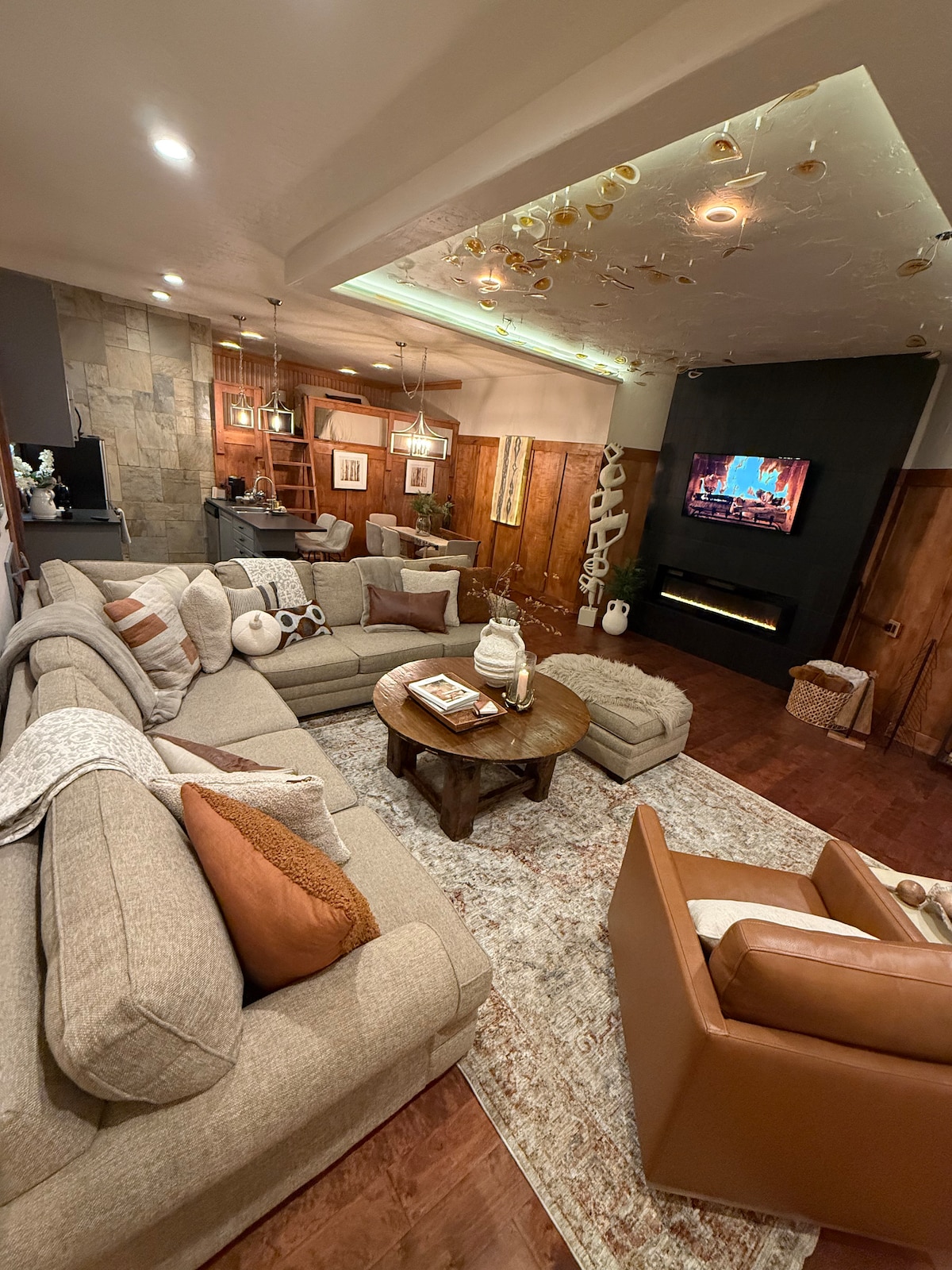 宽敞的步入式地下室,配备65英寸电视、加大双人床、热水浴缸!