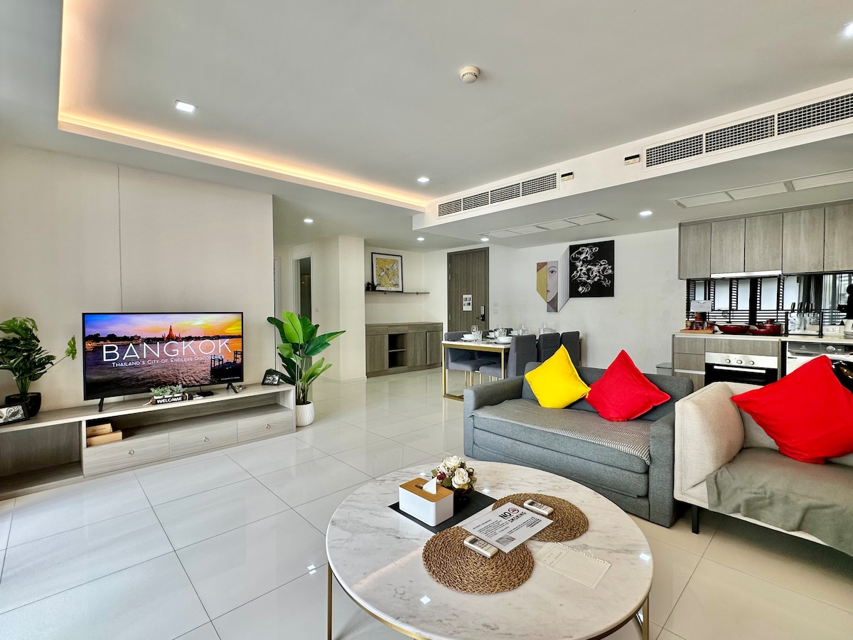欢迎您选择并且入住我的公寓,希望您有一个很棒的泰国之旅。 房子位于RAMA9,2024年交付的LOFT公寓。房间面积70平左右,包括两间卧室、一间客厅和餐厅、一间厨房和两间卫生间,轻松容纳5名成年人。(‼️tps: 在订单入住人数为1-4人时,默认每个卧室里一张床,如果您需要增加客厅铺沙发床,请在预订时将人数填写为5人,并在预订后联系我们特别告知,我们会在您入住前安排工作人员铺好沙发床‼️) 订单价格包括使用整套房源,以及健身中心,游泳池以及共享办公空间的费用。