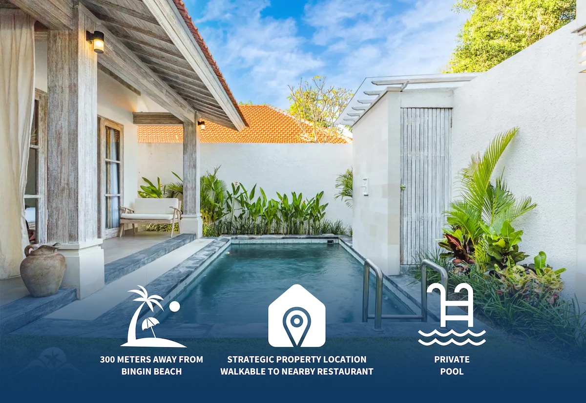 A traditionally inspired villa with a modern twist, located in Bingin. Bingin Beach and Dreamland Beach are easily accessible. Bingin is developing into the most popular trendy tourism destination with excellent restaurants, bars, and shops. White sand beaches, beach clubs, and world-famous surf breaks are only a short ride away. The villa has an ensuite bathroom, and the bedroom is equipped with AC. In the lush garden, you will have your own private pool.